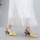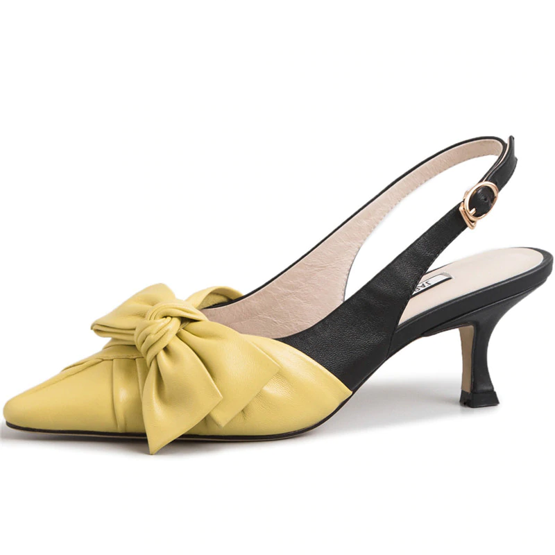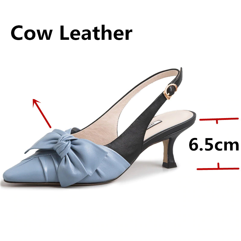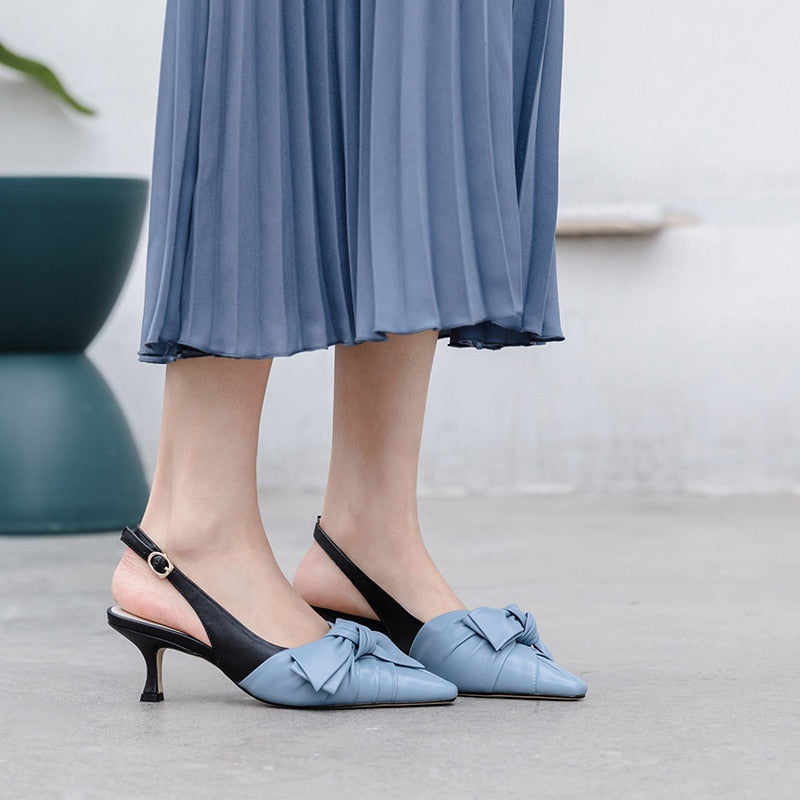 Tacones destalonados de cuero genuino en punta puntiaguda con nudo de mariposa
