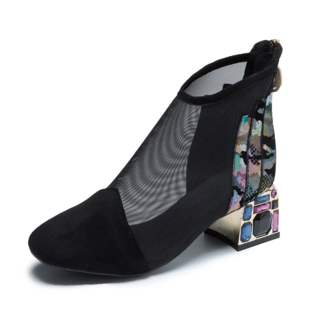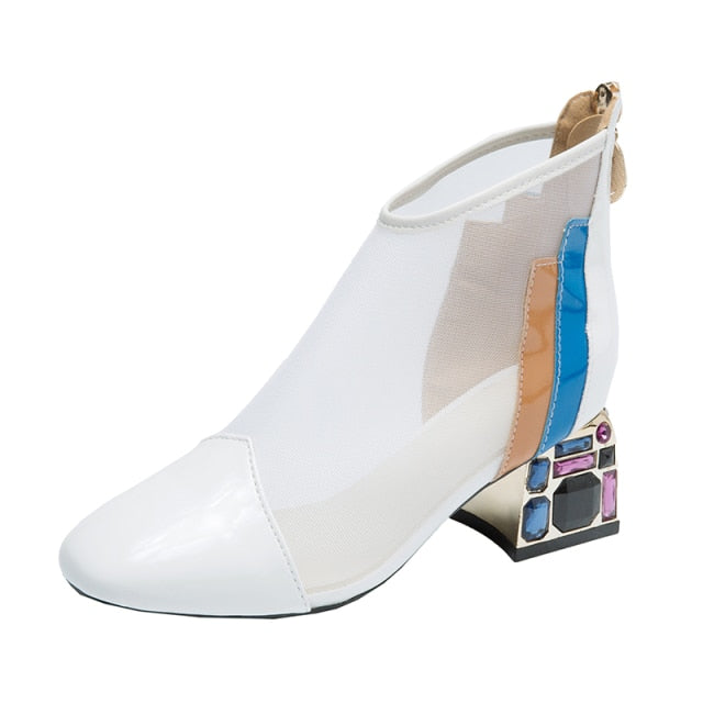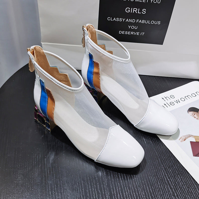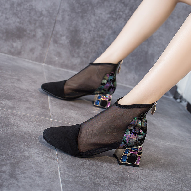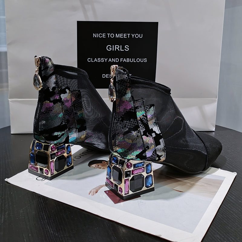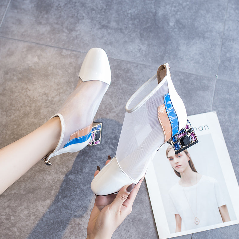 Feeling your best with these ankle boots. The see-through design combined with the colorful stripe makes it fun to style. The artificial gemstones decorated heels also add a unique luxurious touch. These boots are the perfect pair for those who are looking for something different.