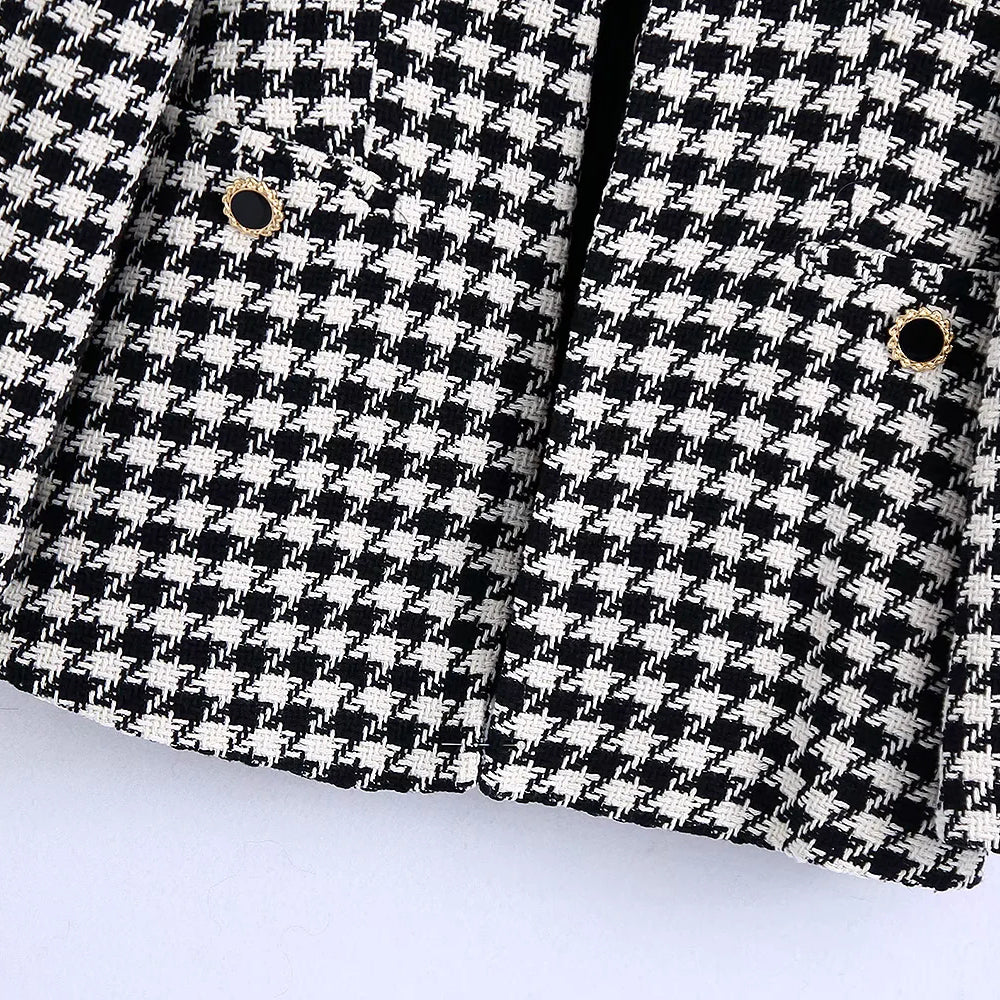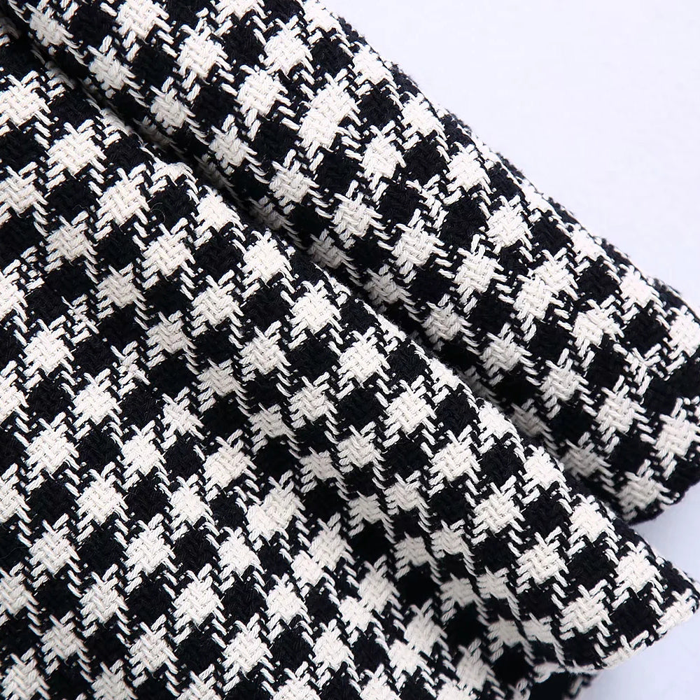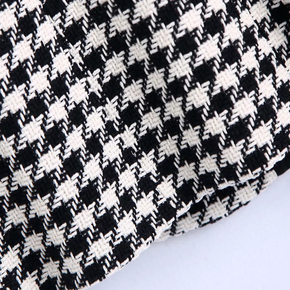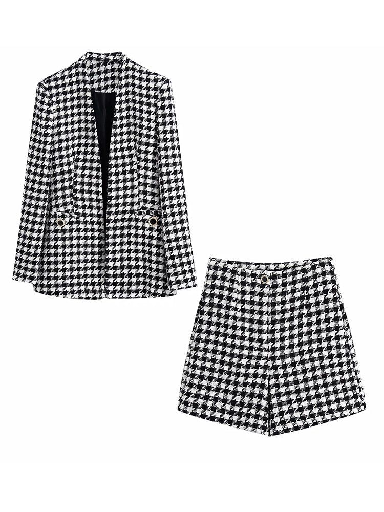The ultimate look for anyone who loves a timeless classic. This set features a full black and white houndstooth pattern. The blazer paired with high-waisted shorts gives it a modern twist and makes it casually elegant.