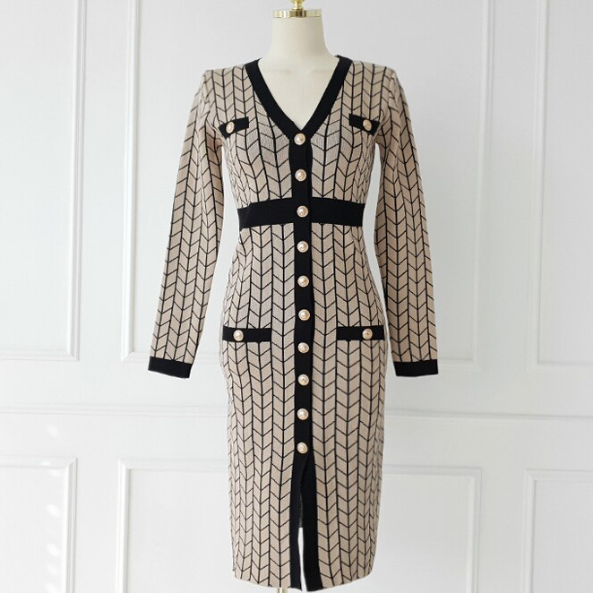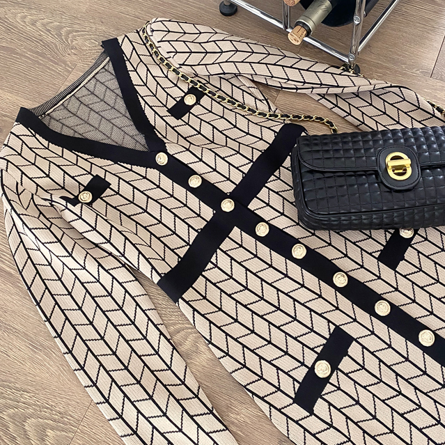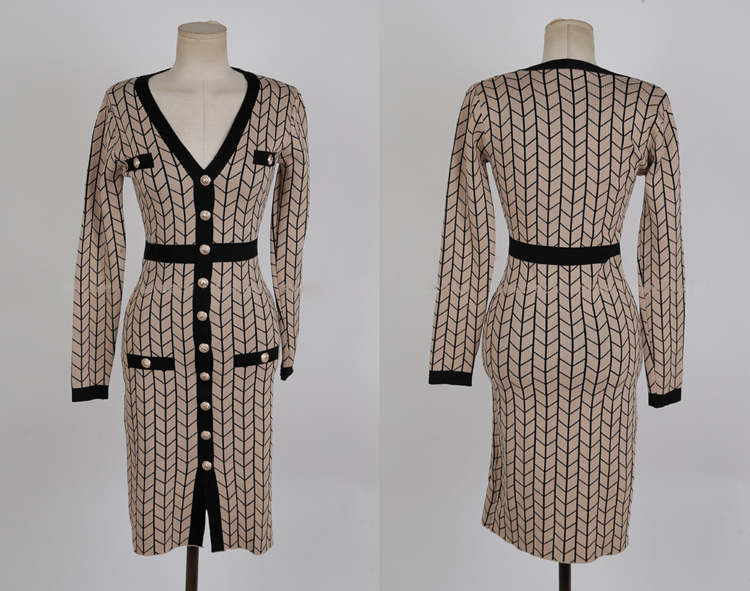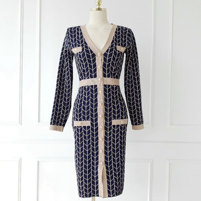 A versatile and flattering midi-length knit dress that looks great for any occasion. It has a simple button closure keeps the dress in place. The contrasting line is simple but stylish. An eye-catching geometric pattern that exudes a fresh, modern look.
