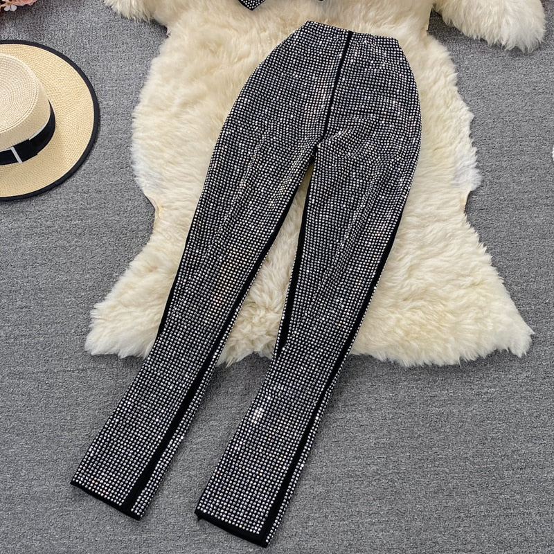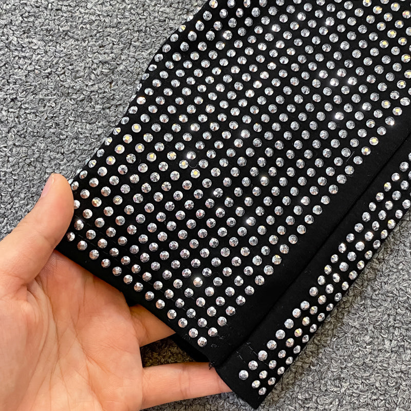 This matching set is the perfect choice for evening occasions. Decorated with rhinestone, make it look elegant. The top of this matching set has a slash neck, so you can showing off your shoulders.