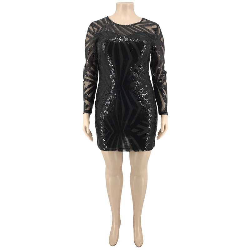 <transcy>Vestido de talla grande de mujer de manga larga transparente con lentejuelas y cuello en O sexy</transcy>