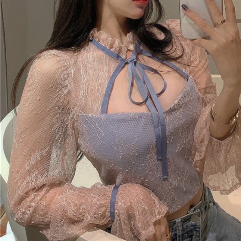 Blusa transparente con manga farol larga y estilo hueco en la parte delantera