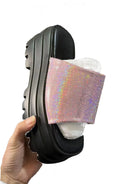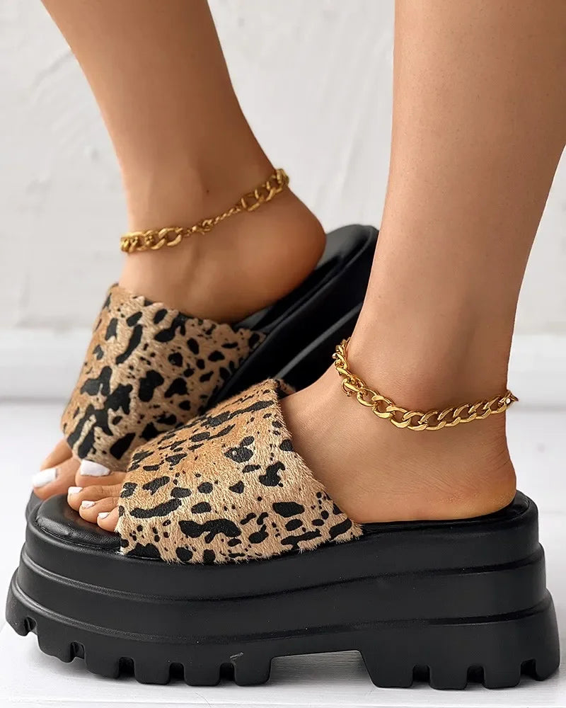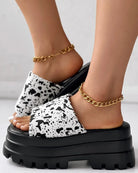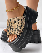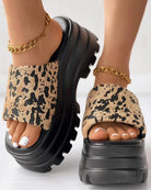Make a bold statement with the Drama Doll Platform Sandals. Crafted from luxurious microfiber leather, these sandals feature a striking solid and leopard pattern that commands attention. Designed for those who embrace fearless fashion, they add height and attitude to any look with their daring platform silhouette.