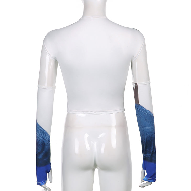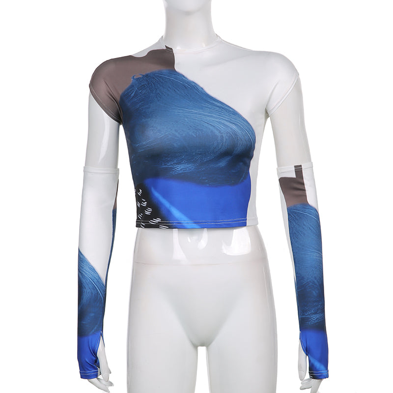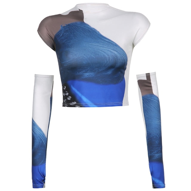 Camiseta de cuello redondo con estampado abstracto y decoración de guantes