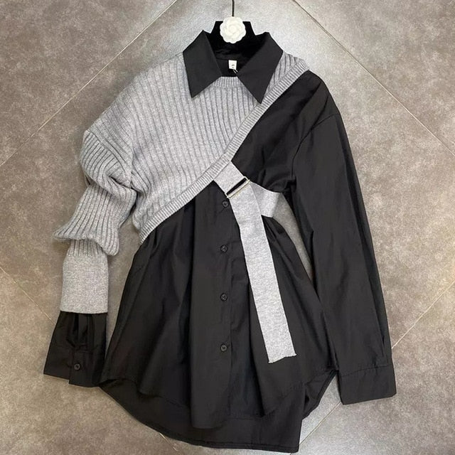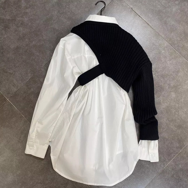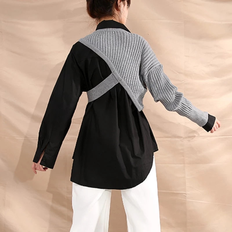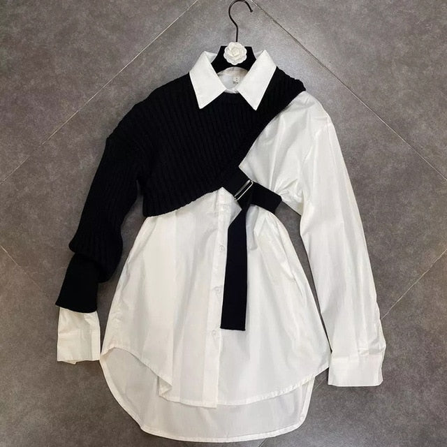 Camisa sólida de un solo pecho de manga larga con cuello vuelto y decoración de chaleco