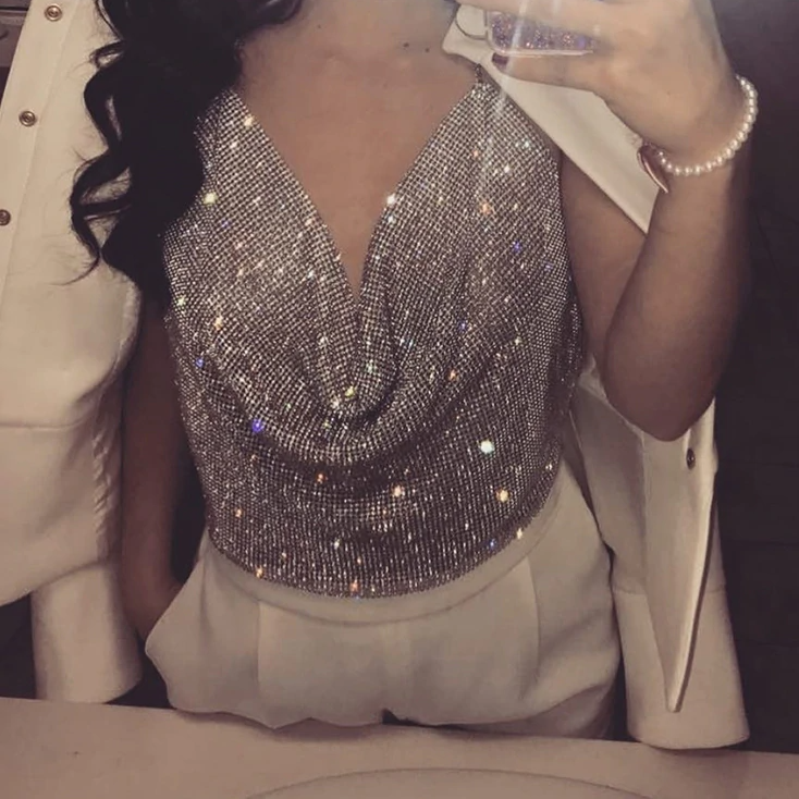 Tops de camisola con lentejuelas a cuadros pequeños y cuello halter