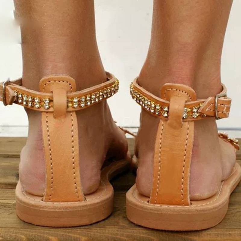 Sandalia plana de piel sintética con tiras en el tobillo y correa decorada con diamantes de imitación con hojas florales