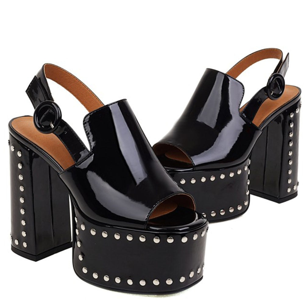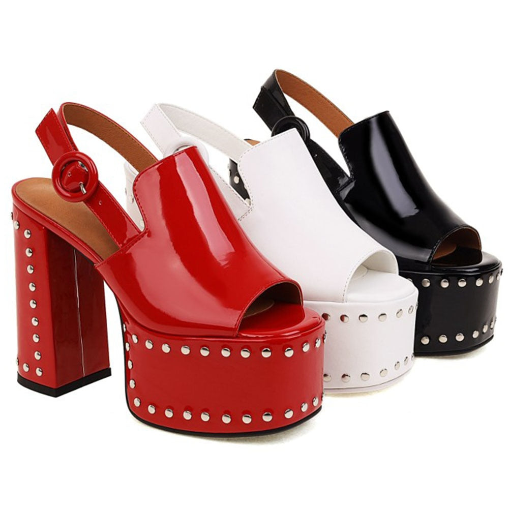 These rivet platformed sandals are the perfect way to complete your look. The thick sole and chunky heel will provide stability and support, while the open toe and slingback ankle strap will give you a more comfortable and easy fit. The wide upper strap will keep the sandal in place. The sleek black, red and white color is versatile and goes with just about anything, so you'll be able to wear these sandals with any outfit.