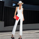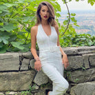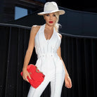 If you're looking for a chic outfit that is comfortable enough to wear all day, this jumpsuit is for you. Made of polyester, this jumpsuit features a halter neck, sleeveless design, and a striped pattern. The white color will go with just about anything in your closet.