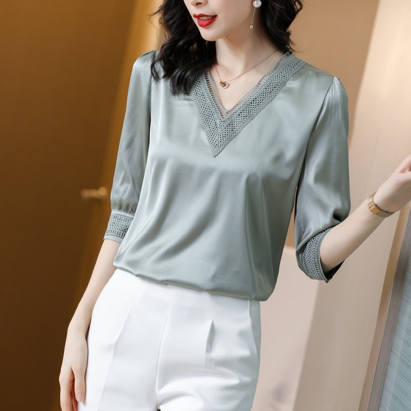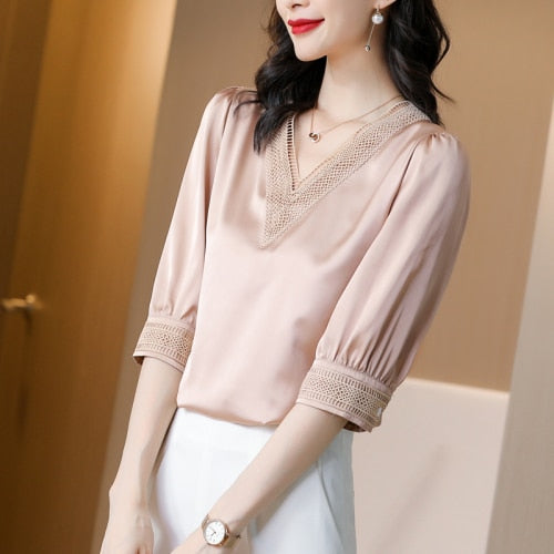 Blusa de licra de seda lyca de media manga con ribetes de encaje