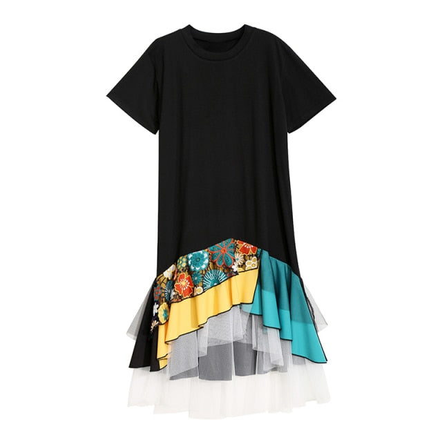 Estilo camiseta-vestido de rayón de algodón con manga corta y cuello redondo
