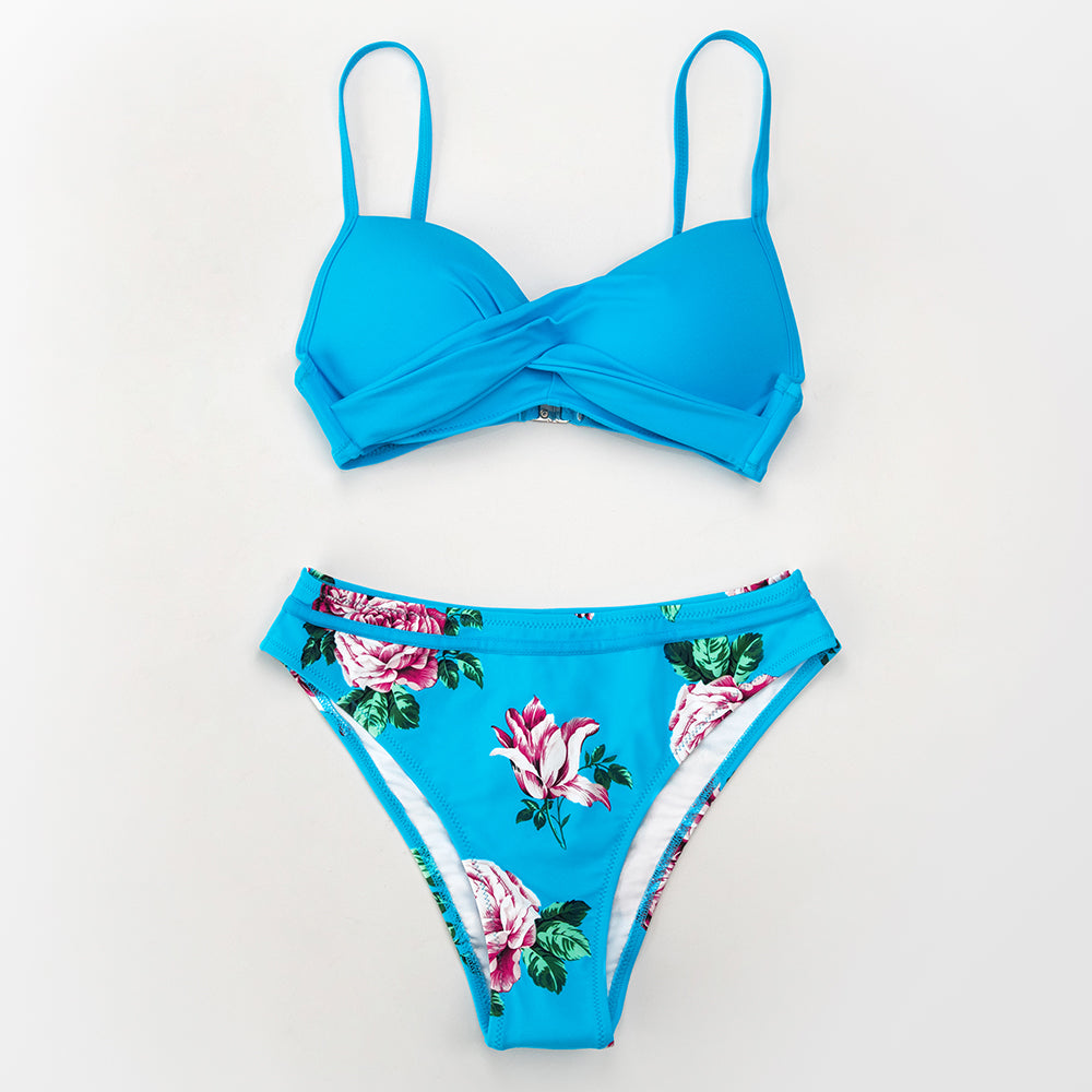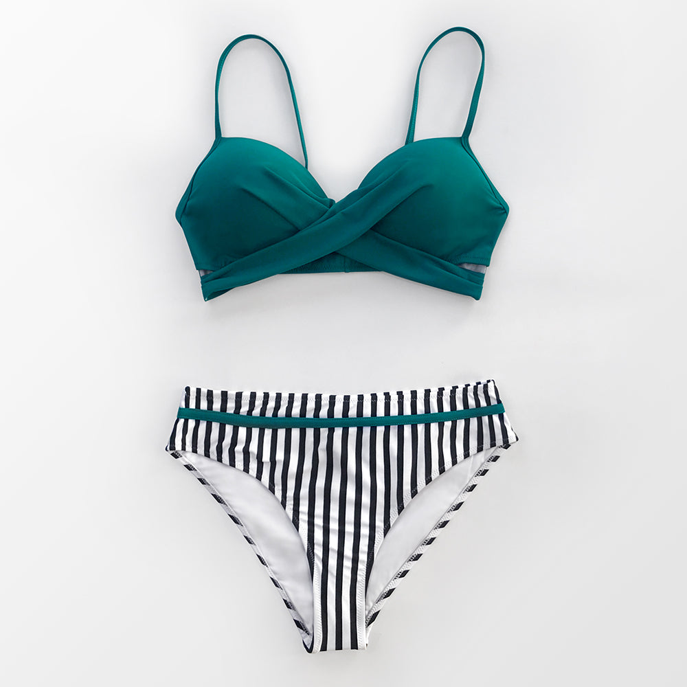 This two-piece retro bikini features a floral and stripe pattern design. This bikini is made of polyester and spandex, making it stretchy and comfortable. A perfect summer piece!