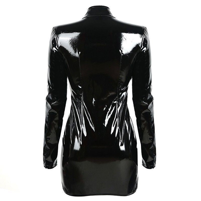 This long-sleeved midi dress is designed to be a part of your everyday wardrobe. It's made from a lightweight PVC material, giving it a stylish and sophisticated look. The turtleneck collar is a chic detail that keeps cool during the warmer months. The buckle strap adds a stylish, feminine accent and can be worn with a variety of different pants