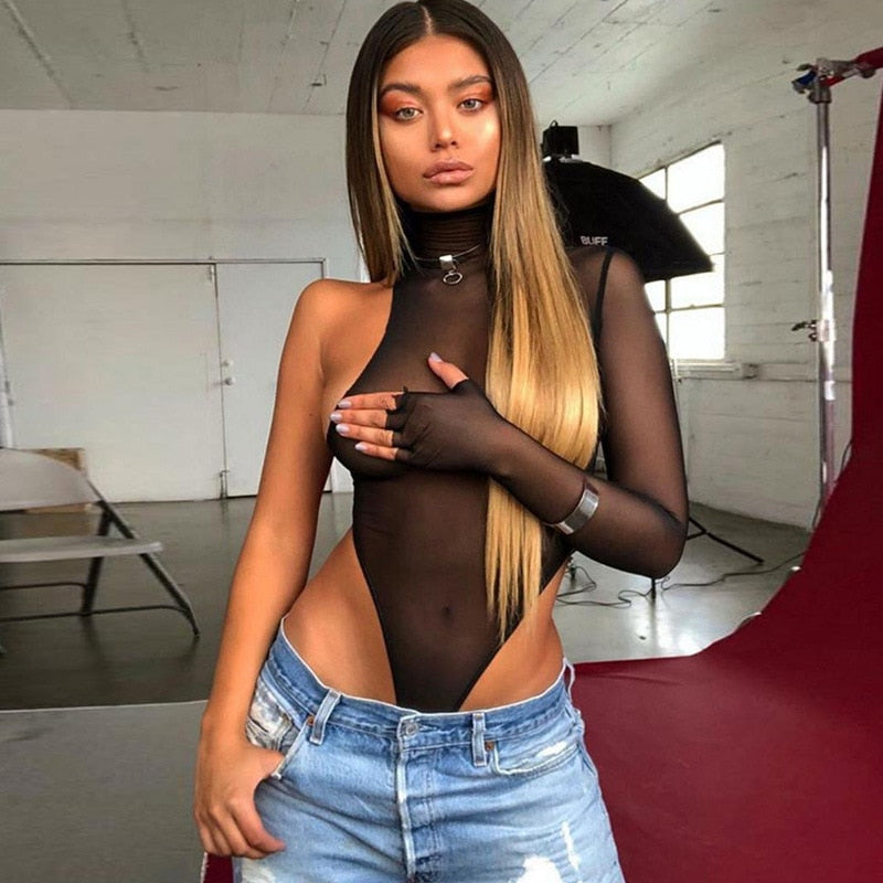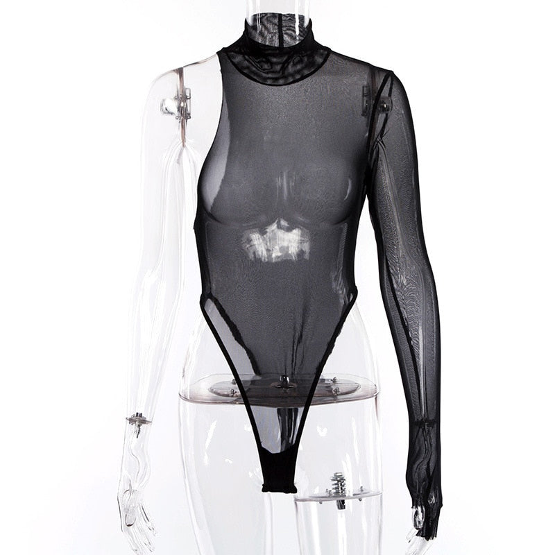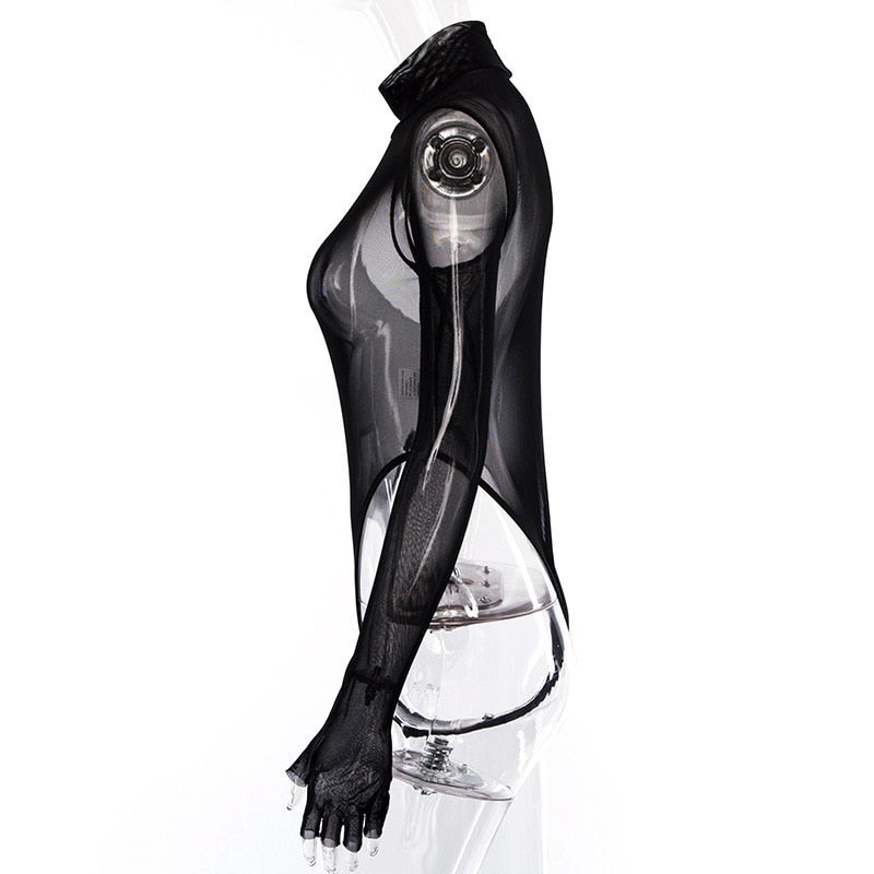 Body de poliéster transparente con cuello alto y estilo sencillo de manga larga