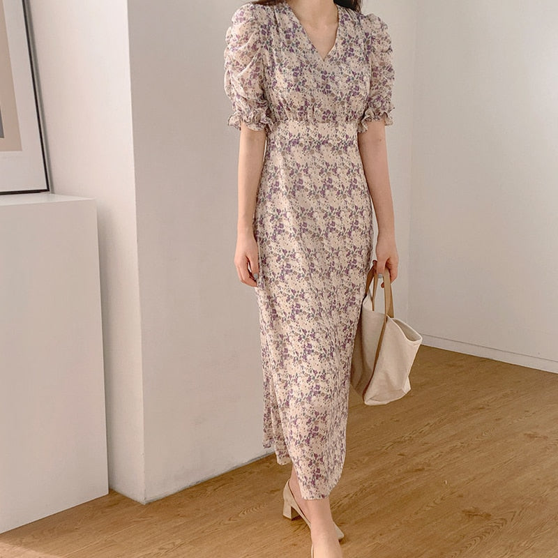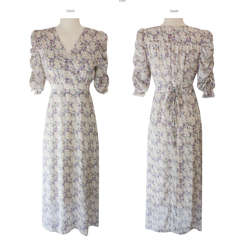 Vestido midi corto de gasa con cuello en V y manga abullonada con estampado de flores