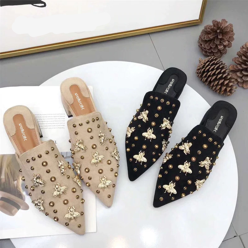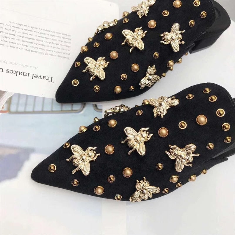uxury Golden Bee Rivet Stud Flock Suede Spike Heels Mules Zapatos