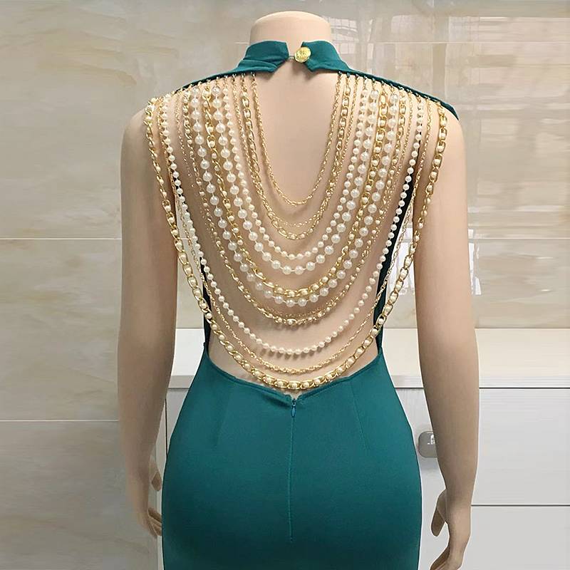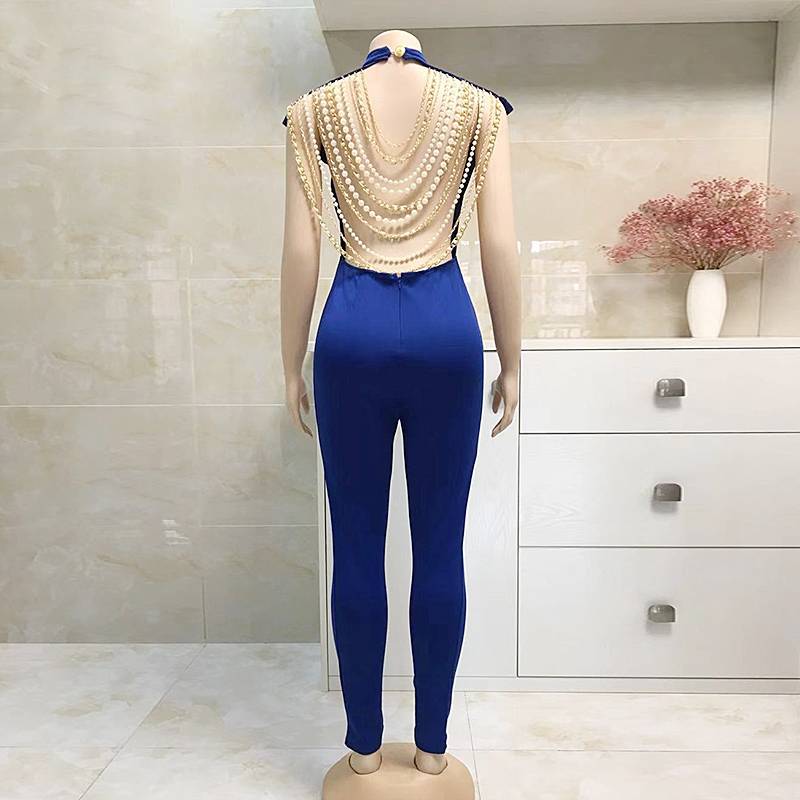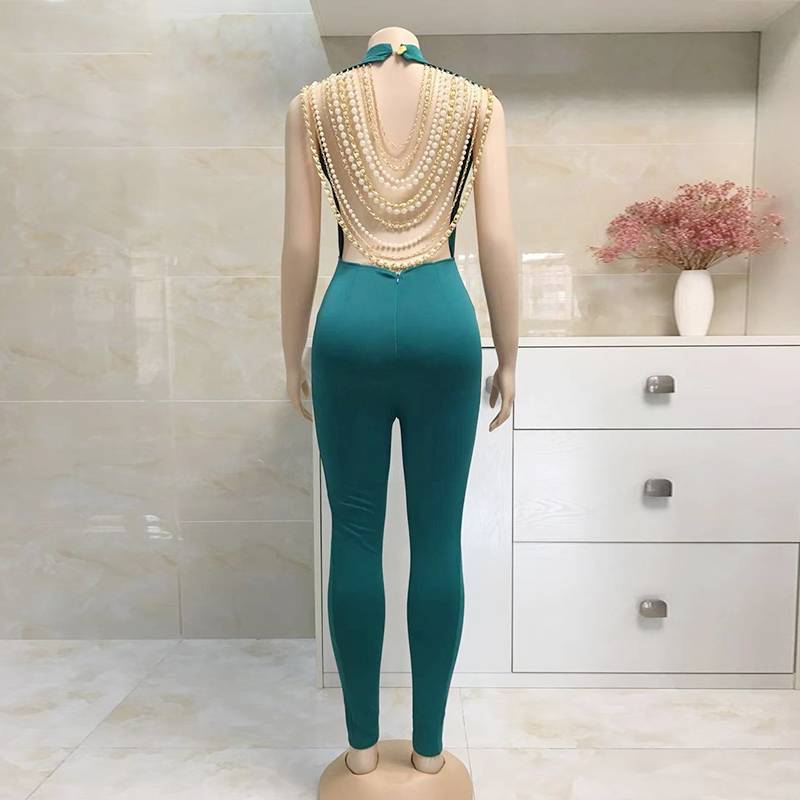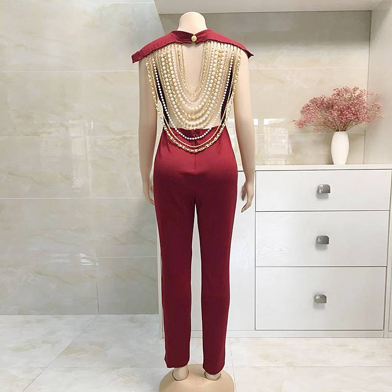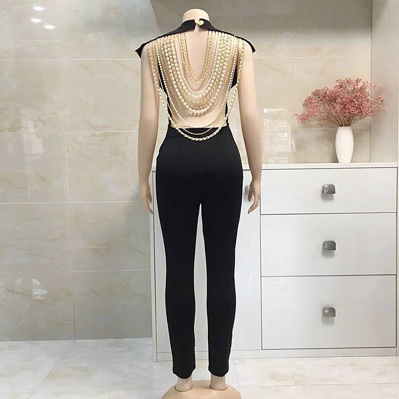 The jumpsuit is perfect for a sleek and modern look. The backless style is adorned with metal chains and pearl beads, adding to its feminine charm and versatility. The polyester and spandex blend material is lightweight, breathable, and comfortable. Coordinate with a wide variety of outfits to create your very own style. This jumpsuit is the perfect way to break out of the ordinary.