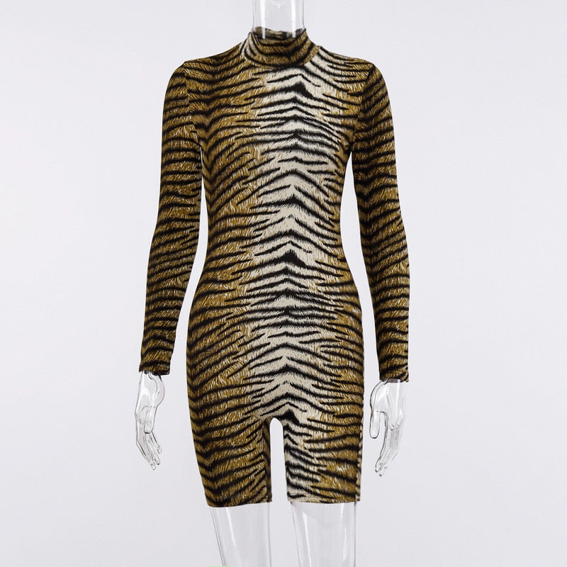 Get ready for the new season with this animal-printed spandex romper. This romper is a must-have for any fashionista who wants to stand out from the crowd. This romper is made of spandex and has long sleeves and a turtleneck. The design features a bright animal print and is perfect for a night out. Pair this romper with heels or boots and a bold necklace to complete the look.