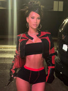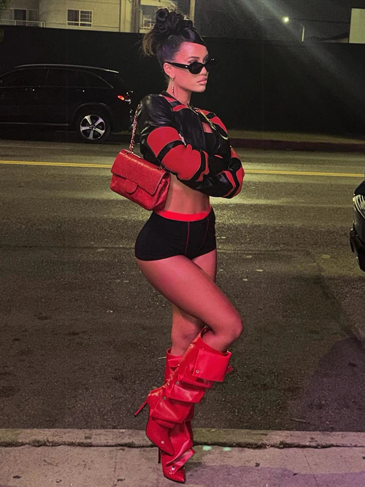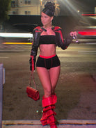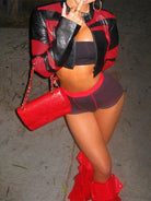Make a fearless statement with the Noir Romance Crop Jacket, where edgy sophistication meets undeniable allure. This striking piece features premium PU leather that delivers a sleek, polished finish with an unmistakable attitude. The cropped silhouette hugs your frame while the rich noir palette exudes confidence and mystery.