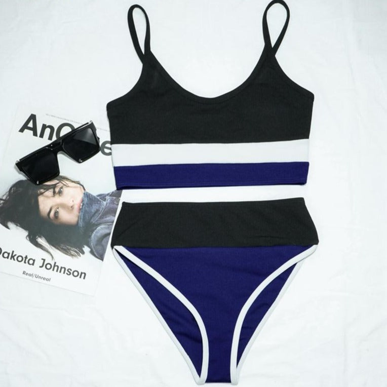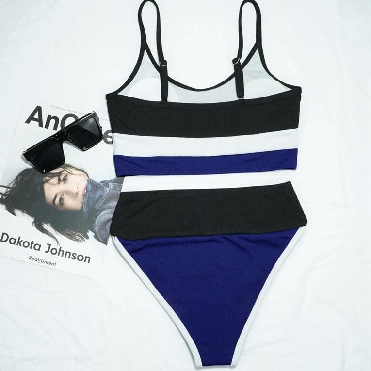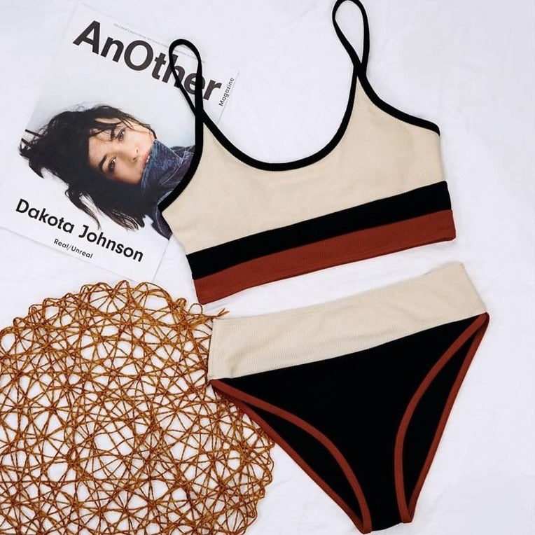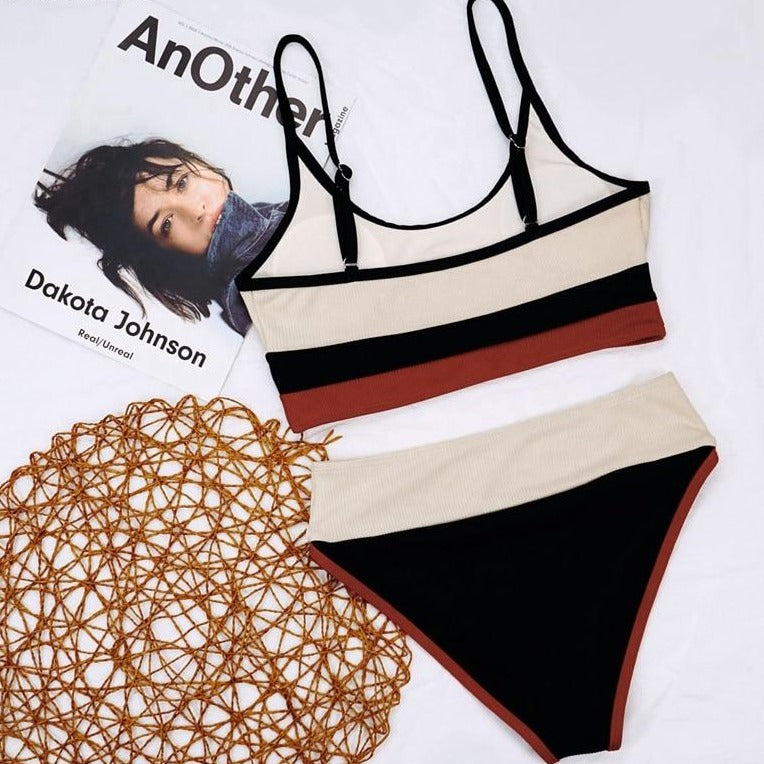 Bikini retro estilo tres tonos a rayas con material de poliéster