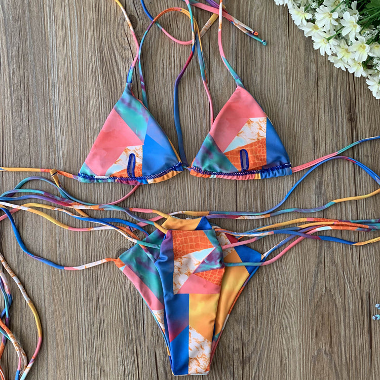 If you're looking for a unique bikini that's sure to turn heads, this is the one for you. With a geometric pattern design and halter top style, this two-piece swimsuit is perfect for someone who likes to be the center of attention.