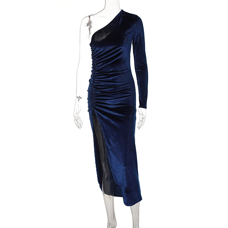 This beautiful Frozen Roses dress features a unique diagonal collar and a luxurious mid-calf length. Made of soft velvet material, it offers a comfortable and stylish fit. The pullover closure and full sleeves add convenience and versatility to this solid-colored dress. Make a statement with this eye-catching piece.