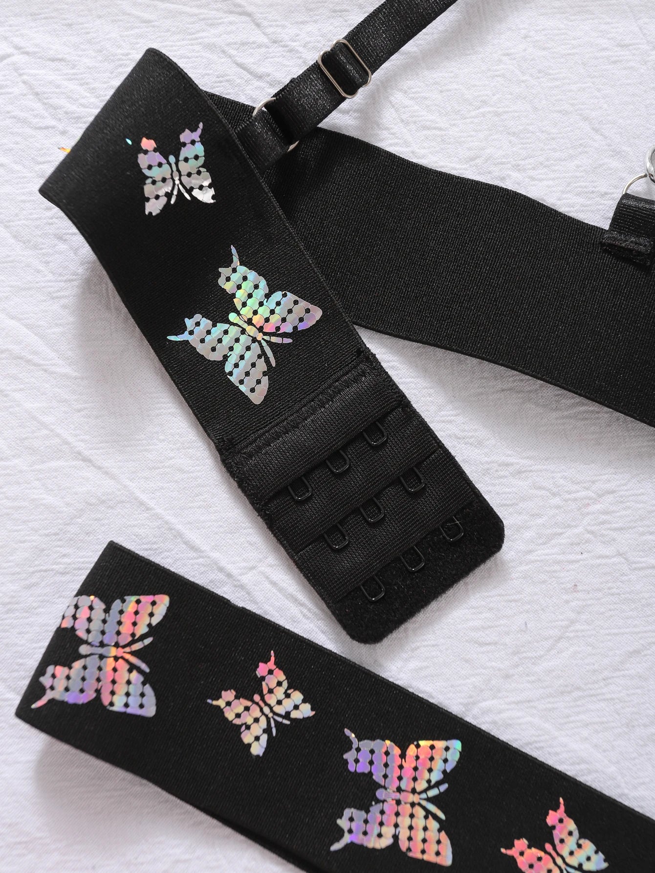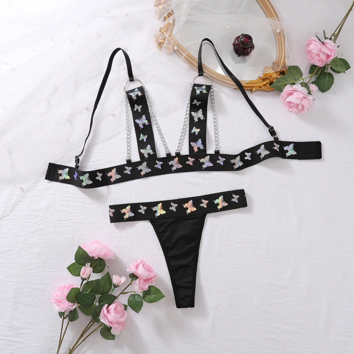 Transform into a sexy butterfly with our I've Been Broken Lingerie Set. Made from soft, luxurious polyester blends and adorned with delicate butterfly-shaped lace, this set will make you feel confident and sensual. The addition of a chain decoration adds a touch of playfulness and intrigue. Indulge in your femininity and spice up your love life with this beautiful set.