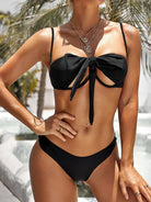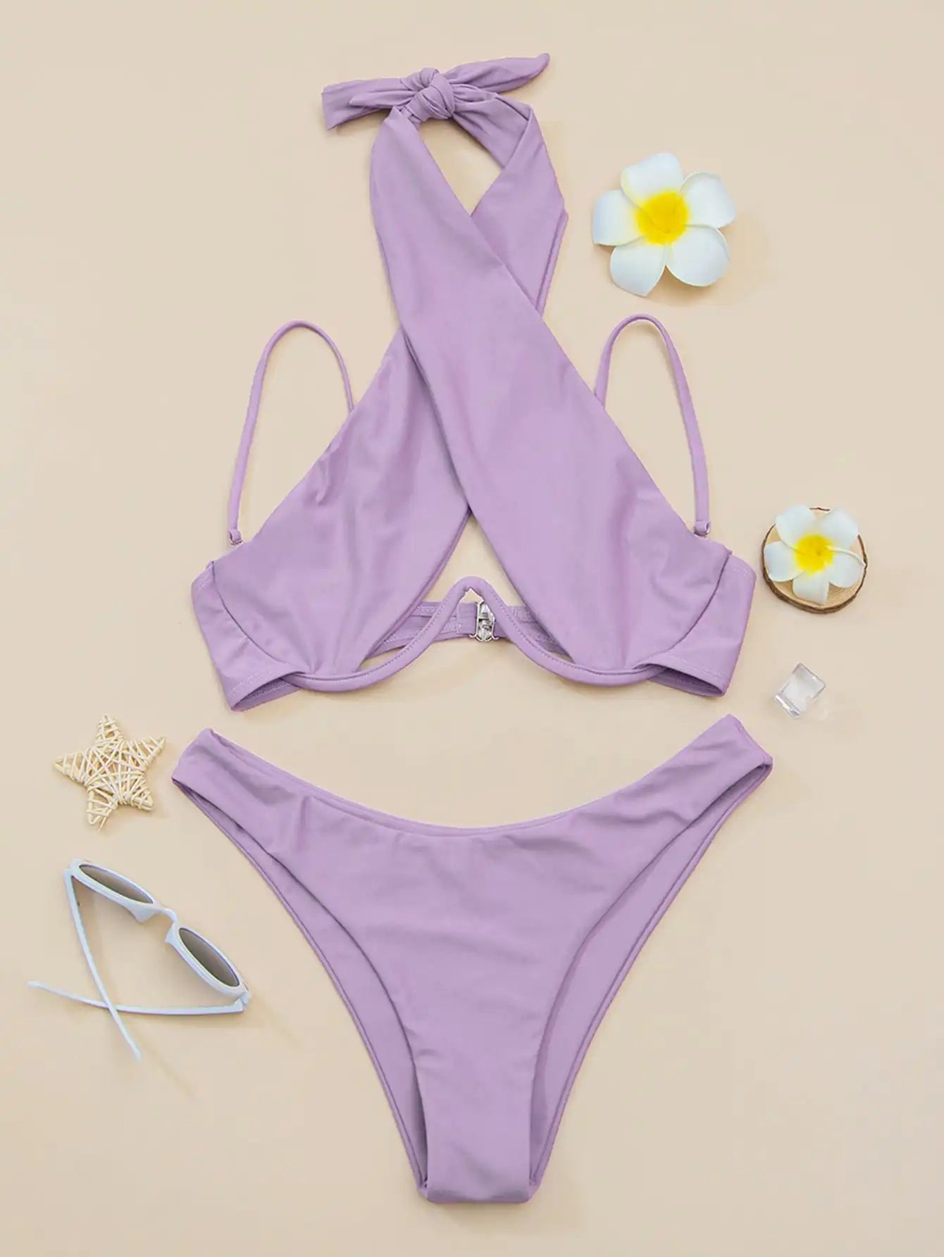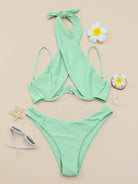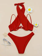The Serpent Charm Bikini features a bold halter twist design in sleek solid fabric made from polyester and spandex. Its daring cut sculpts your silhouette while the confident style ensures you make a striking impression wherever you go.