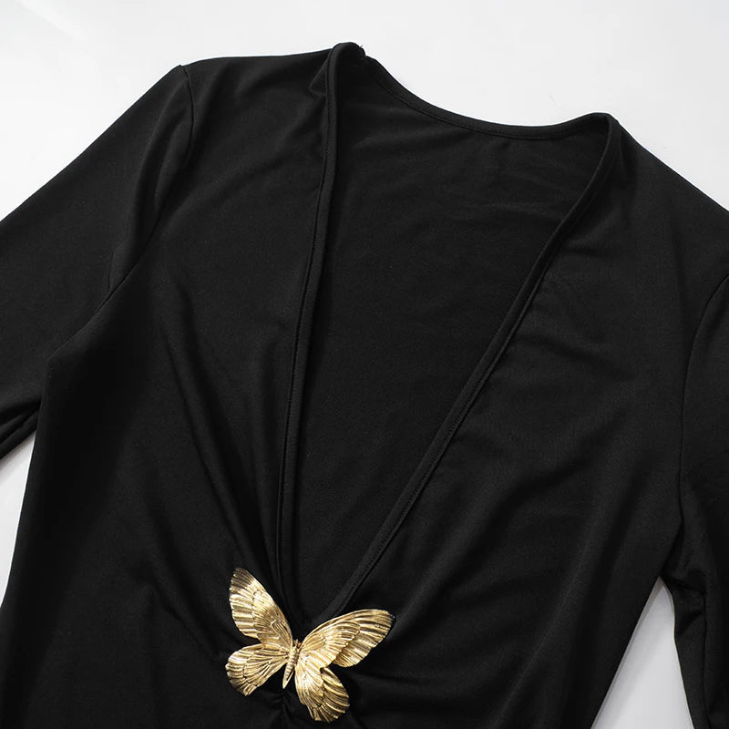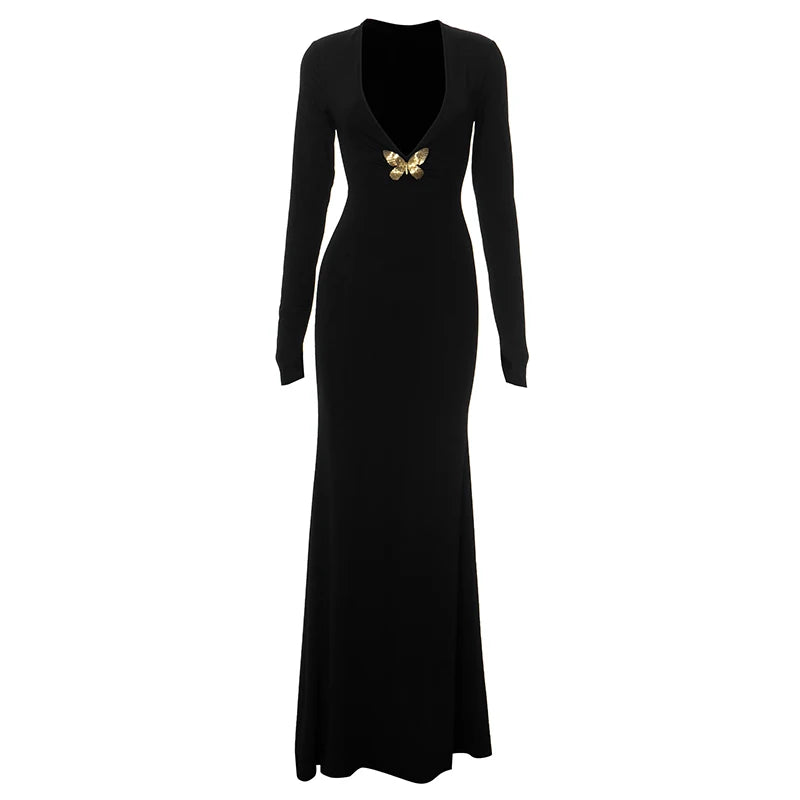 Elevate your style with The Golden Year Long Dress. Its trumpet/mermaid silhouette and V-neckline create a sexy & club look, while the appliques add a touch of elegance. Made from cotton and polyester, this floor-length dress is perfect for any occasion. Step out in confidence and turn heads with this must-have piece.