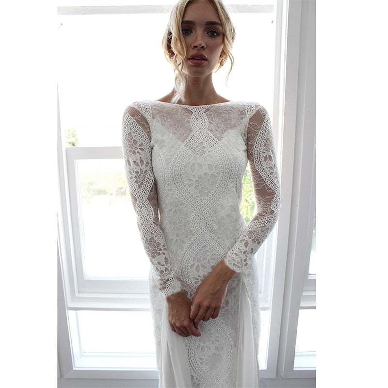 Looking for a beautifully simple dress that is sure to make her stand out in a crowd of beautiful girls? This long dress is perfect for any occasion. The simple backless design makes it easy to slip on and off. The long length is ideal for ladies who need extra coverage. A beautiful white lace design complements this feminine dress. The very simple design is a great choice for a bride-to-be who wants to make a statement.