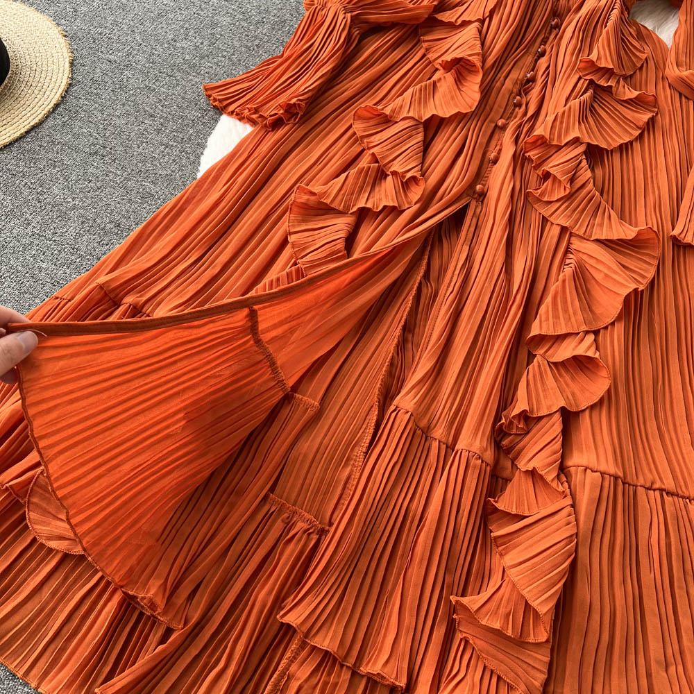 Look at this beautiful maxi dress! This dress is made of polyester, is ankle-length, has ruffles, A-line, lantern sleeve, and v-neck. It is a simple yet flattering design that will make any woman feel comfortable and beautiful.