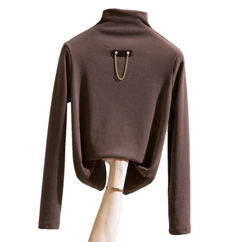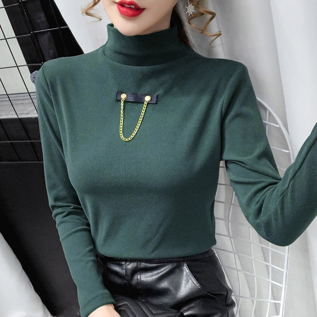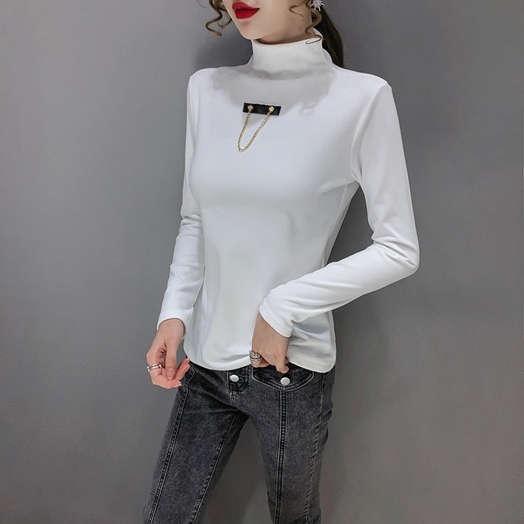 Camiseta de cuello alto de manga larga con decoración de cadena y material de poliéster spandex