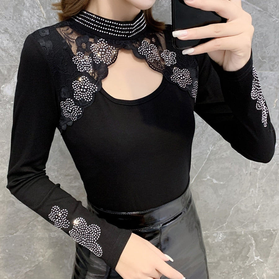 This long-sleeved blouse is perfect for casual days in the office or in the fresh air. It's made in a casual, versatile black color that's easy to wear with most outfits. The rhinestone detailing is a fun touch that helps make this blouse more special. Wear this comfortably with pants or jeans.