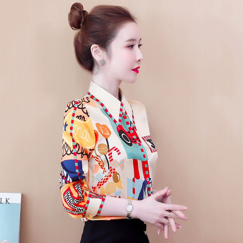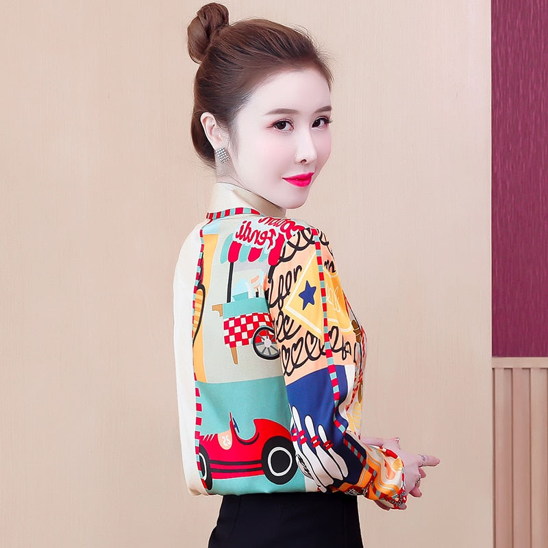 Camisa de manga larga con estampado de dibujos animados coloridos y cuello vuelto