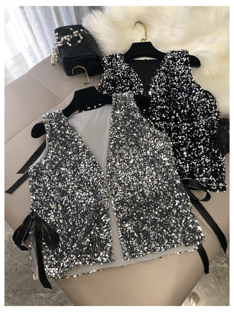 Our women's vests are a great way to dress up her summer wardrobe for a more stylish look. This v-neck style is a versatile choice that can be dressed up or down. The sequined details add a playful touch to this versatile piece. This is a high quality vest that can be dressed up or down. It's a unique and stylish choice that can be worn for any occasion.