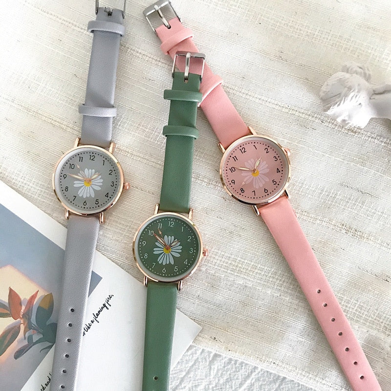 Precioso reloj redondo de acero inoxidable con diseño de margaritas con correa de piel sintética y movimiento de cuarzo