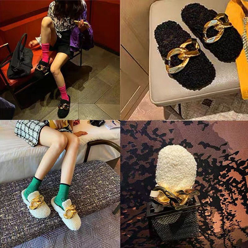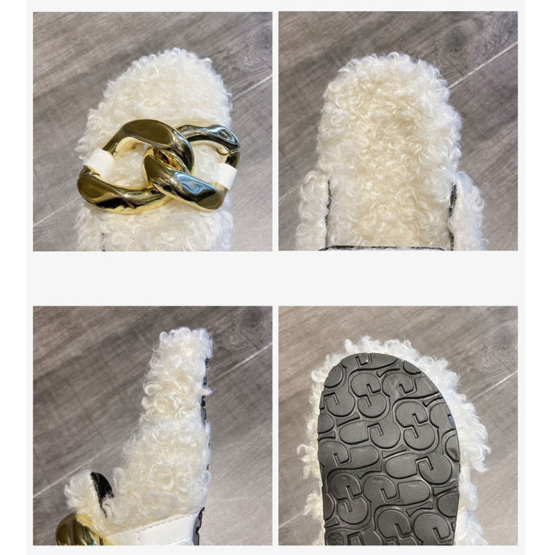 Sandalia sin cordones de color sólido con decoración de cadena, felpa, goma y material de piel