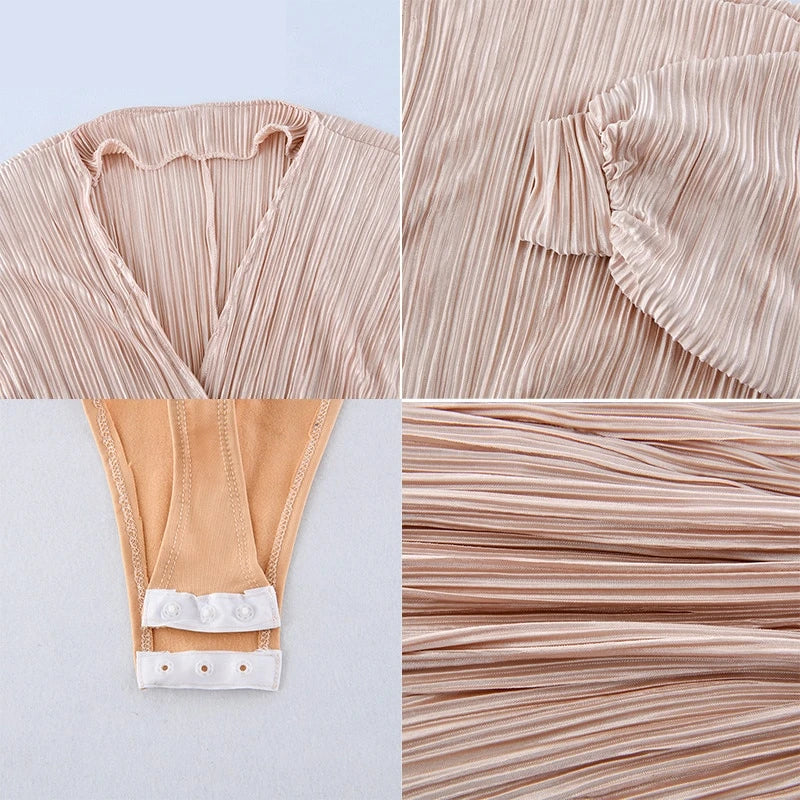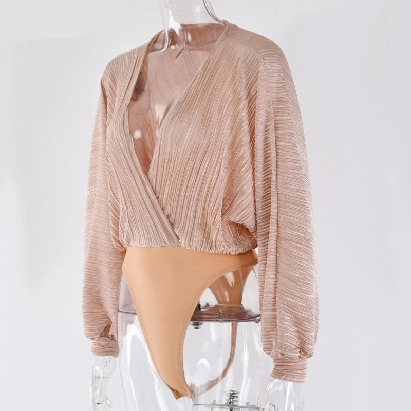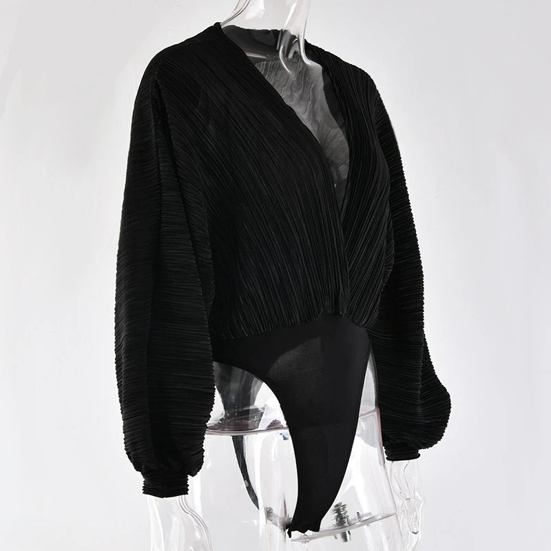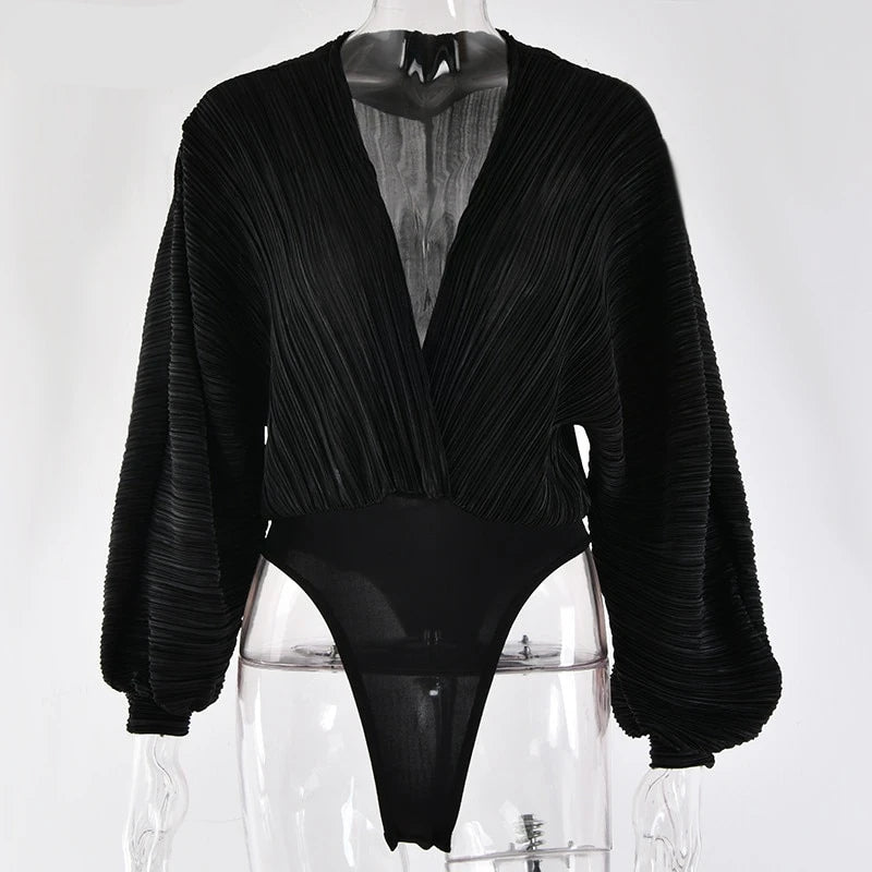 Body de manga larga con cuello en V de color liso de tela de paño fino de licra