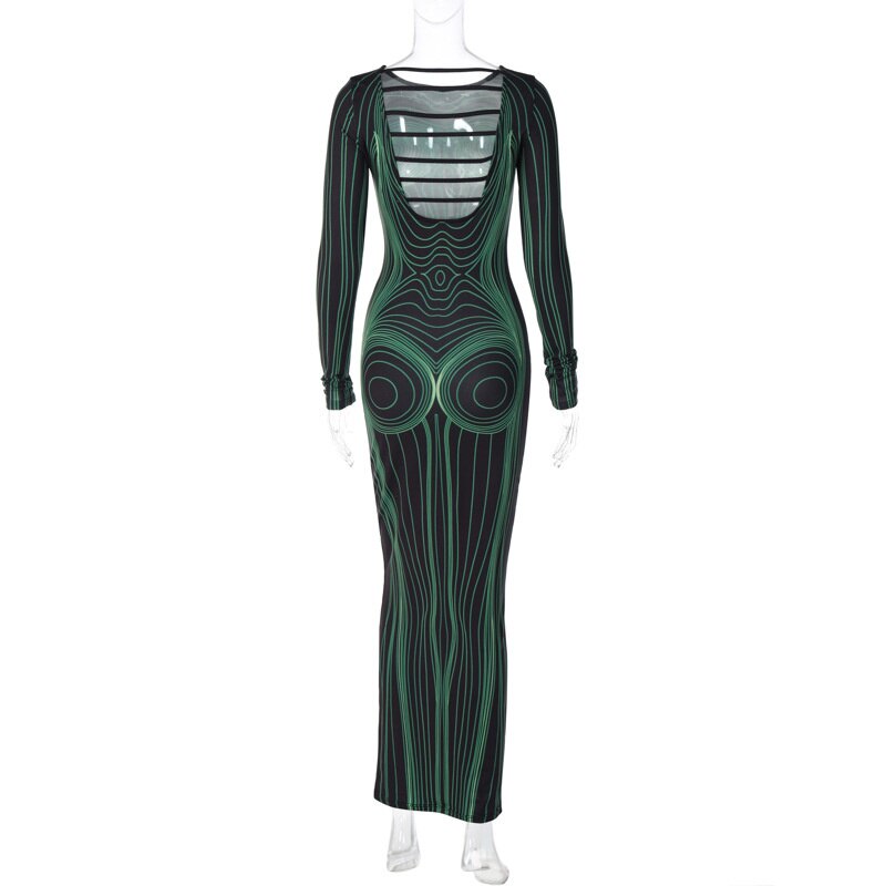 This long-sleeved maxi dress is a statement piece that is perfect for any occasion. The attractive green pattern is paired with a sexy neckline that features a flattering spandex material. Pair with a wide range of accessories to complete this flattering look.