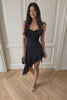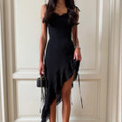 Dare to turn heads in this audacious mini dress that defies convention. The diagonal asymmetrical cut creates an unexpected silhouette that moves with confidence, while delicate ruffles add a playful edge. Perfect for those who refuse to blend in—this piece demands attention and rewards the bold. Slip into something that challenges the ordinary and celebrates your fearless style.
