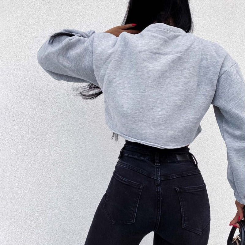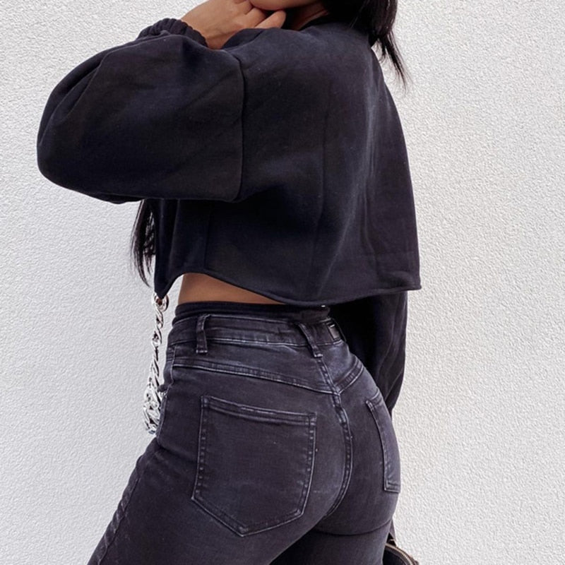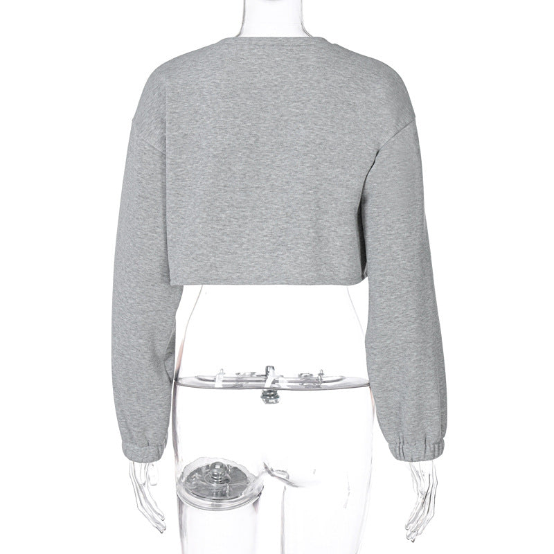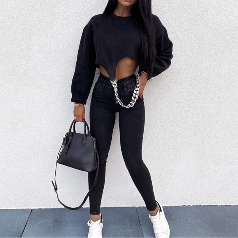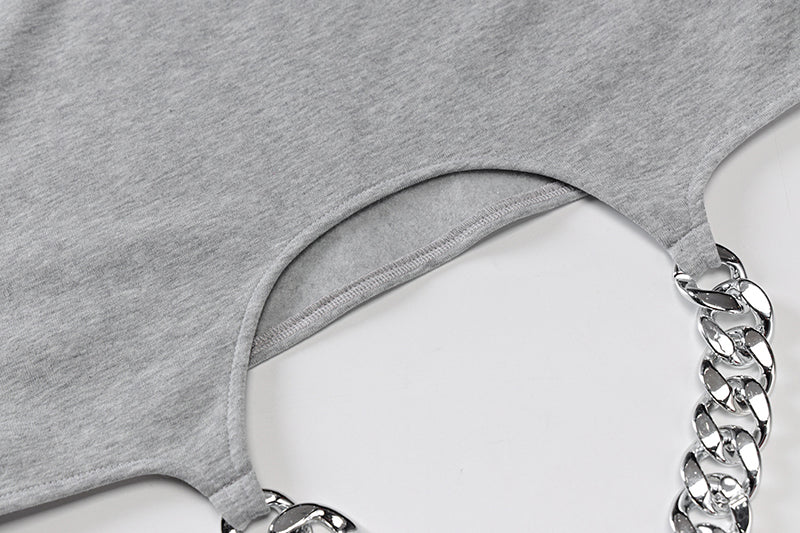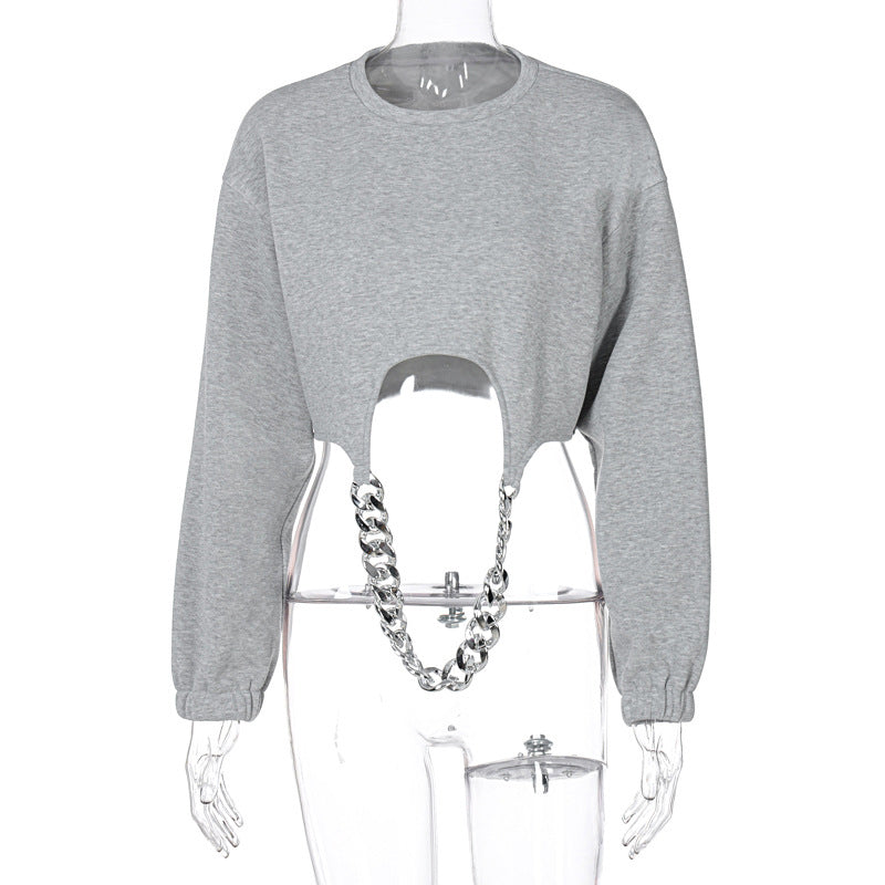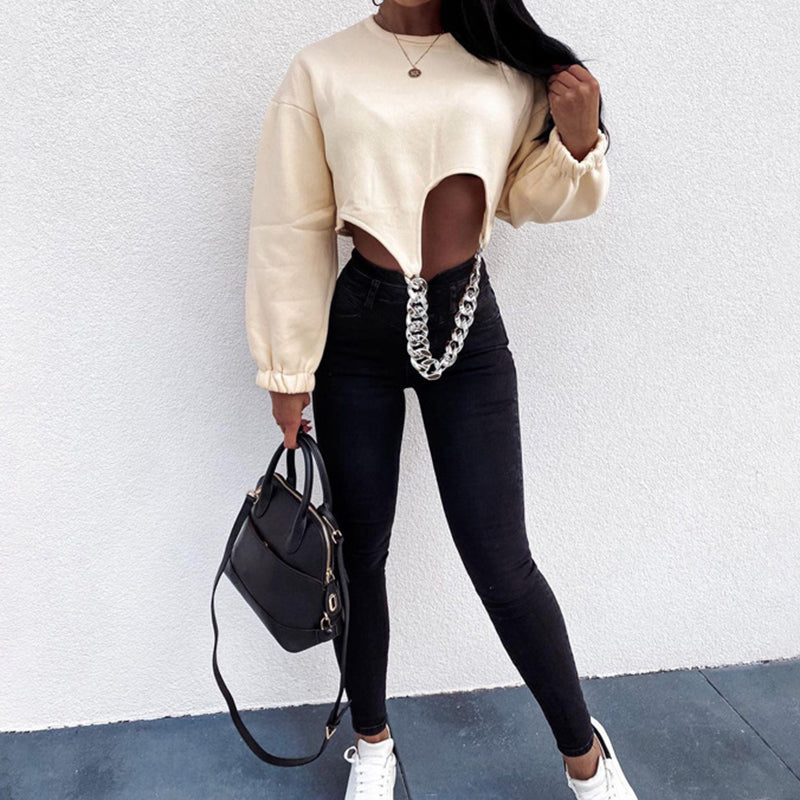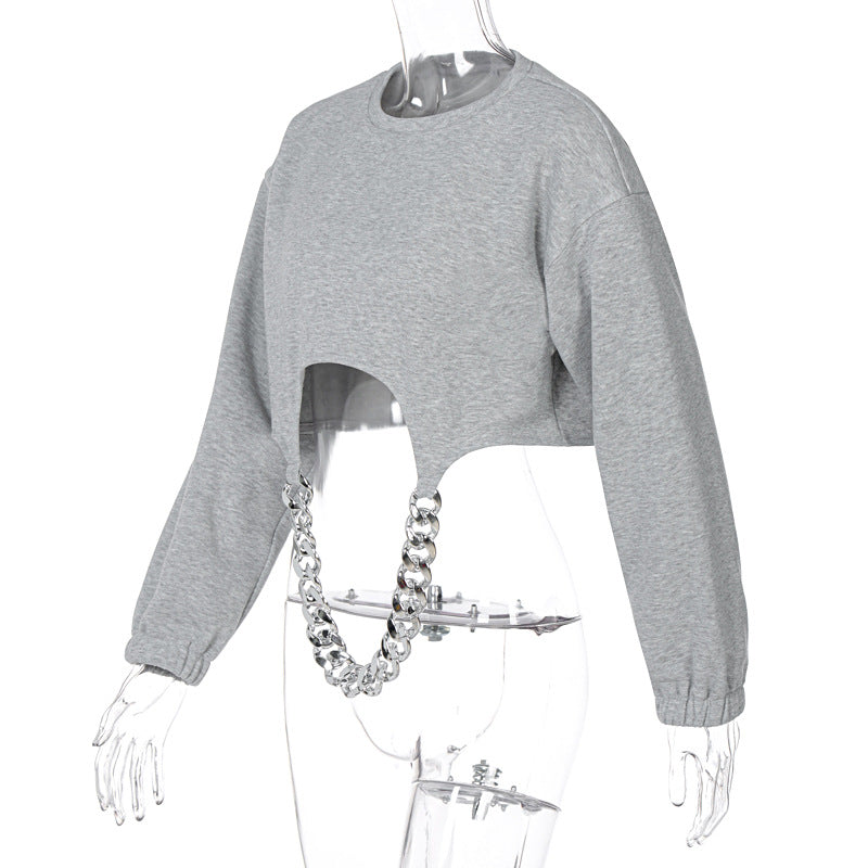 Top corto de spandex de poliéster sólido de manga larga con decoración de cadena