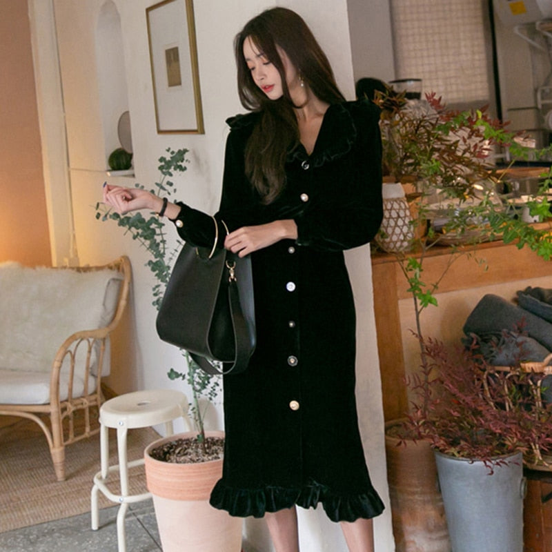 Vestido de decoración de volantes a media pierna de terciopelo de algodón y licra de poliéster