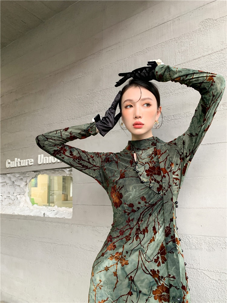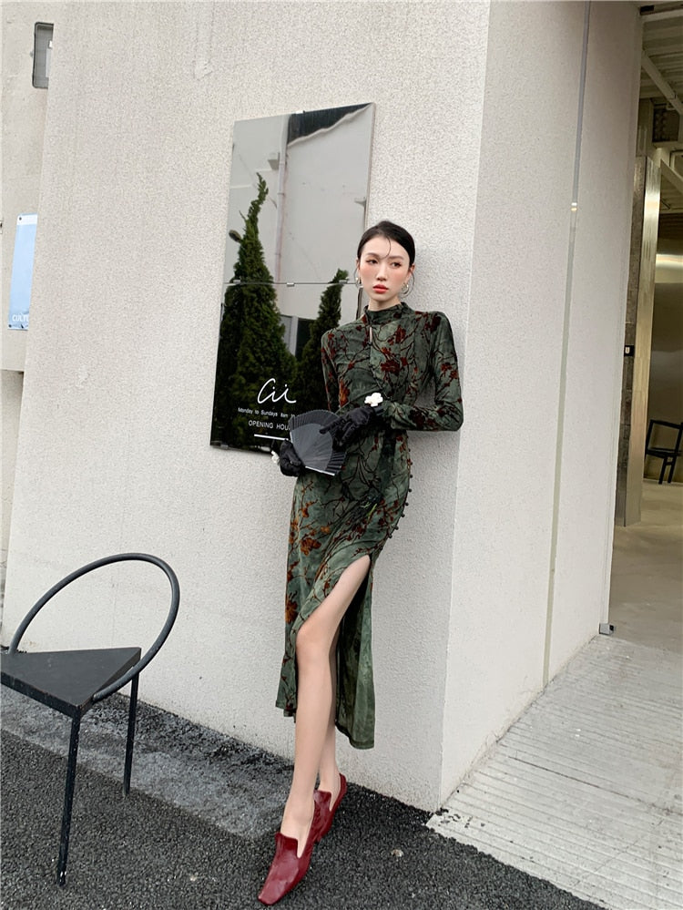 Dress up your everyday look with this grey vintage velvet midi dress. It features a high neckline and long sleeves. The skirt has a side slit and a floral vine pattern. Pair with your favorite heels and a simple clutch for a classy and elegant ensemble.