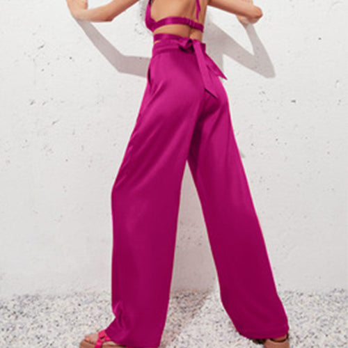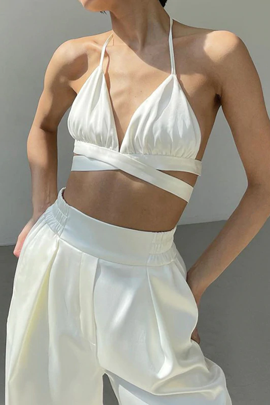 Set your look to stun with this full outfit set! From a halter crop top to lounge pants, this set has it all. Whether you're out with friends or just want to look good while lounging at home, this outfit is sure to make you feel good.