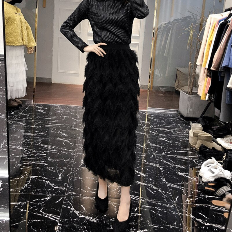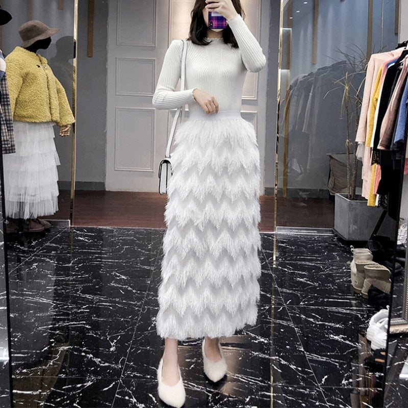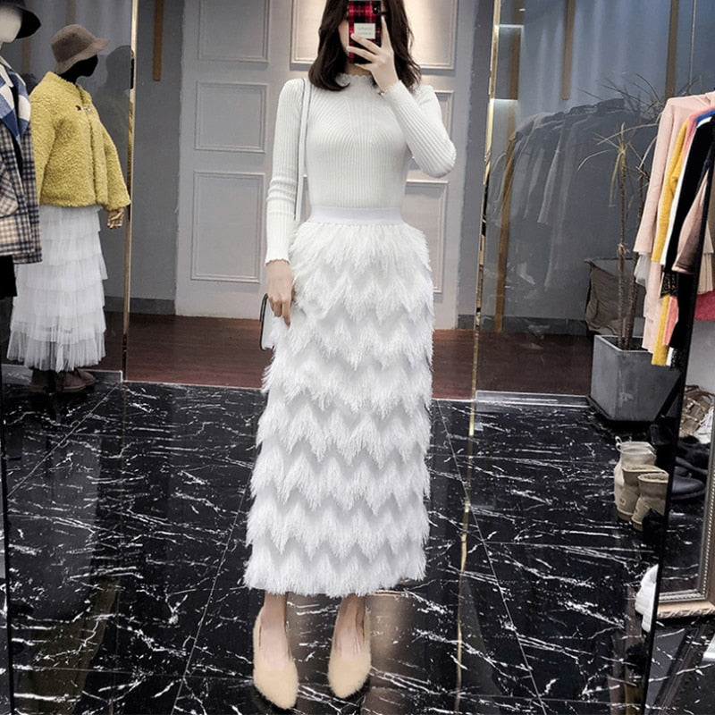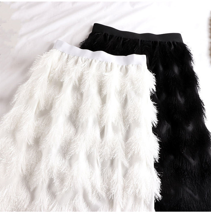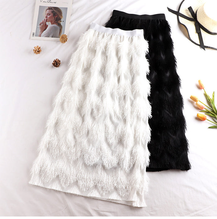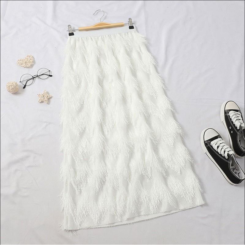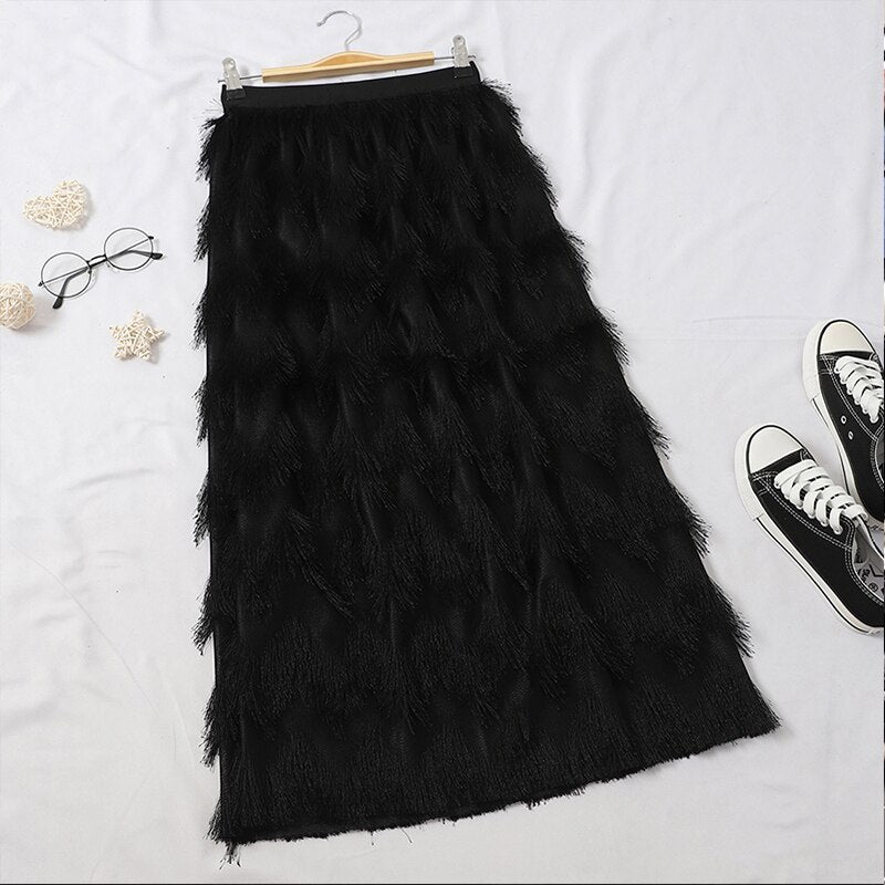 Polyester Mid-Calf Skirt with Elastic Empire High Waist and Decorated with Tassels