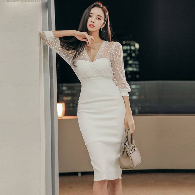 For a look that's as stylish as it is sexy, this v-neck midi dress is a must-have. It can be worn from day to night for a bold but elegant look. The half sleeve is see-through with a polka dot pattern.