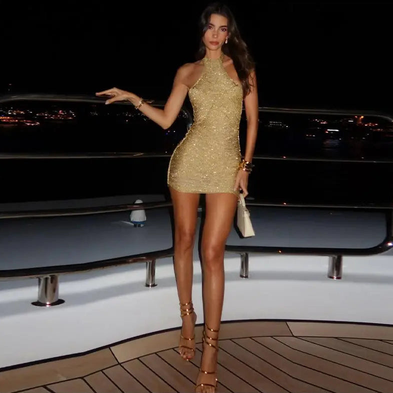 Slip into pure glamour with this Gold Shimmer Knit Halter Mini Dress—a show-stopping piece that commands attention. The luxurious shimmer knit fabric catches light with every movement, while the flattering halter neckline frames your shoulders with bold confidence. Cut to a chic mini length, this dress transitions effortlessly from night out to special occasions. Perfect for those ready to turn heads and make a statement.