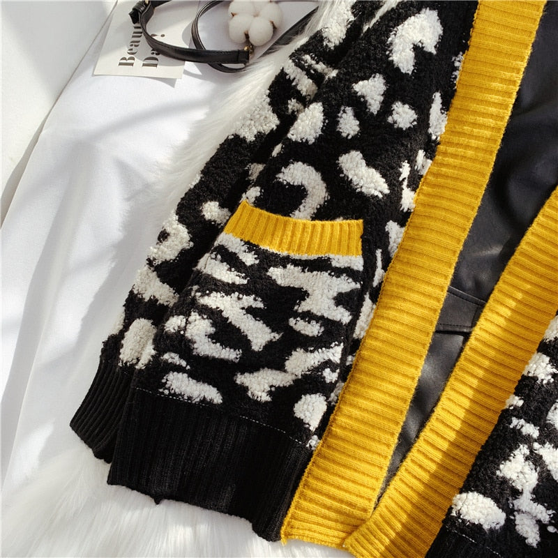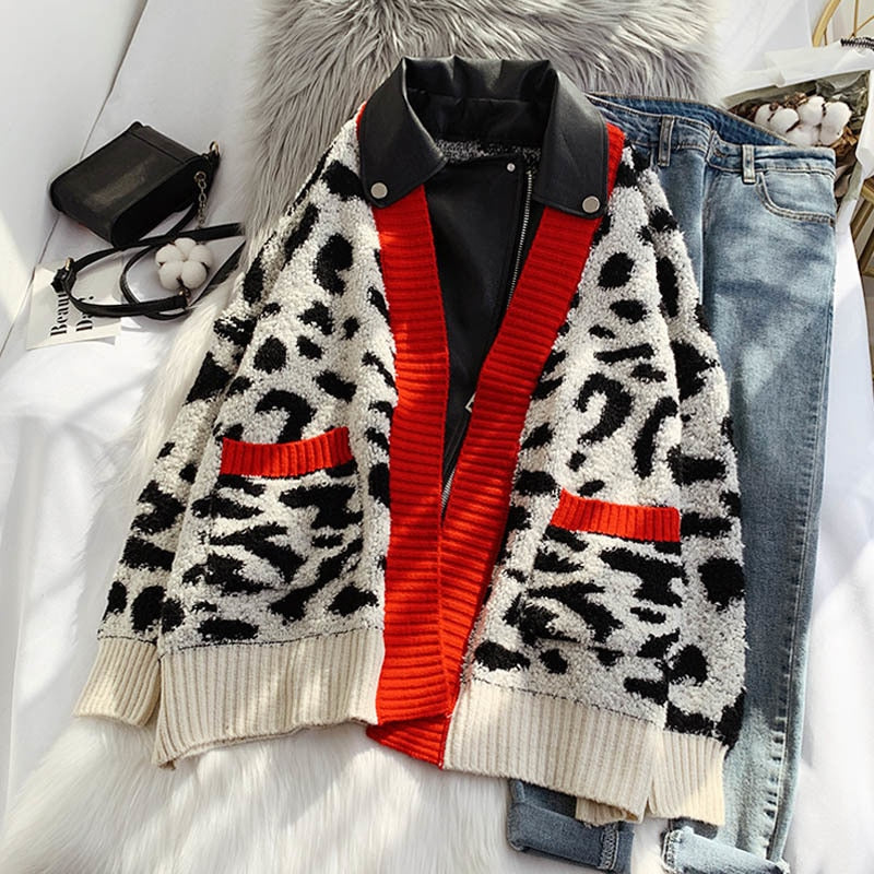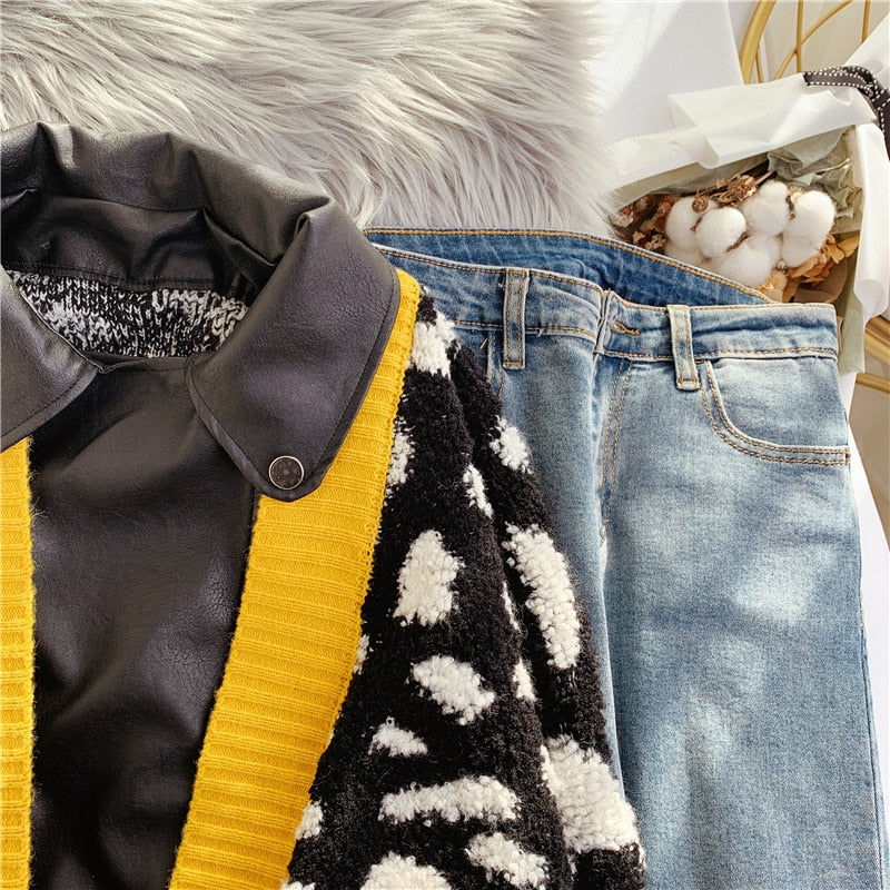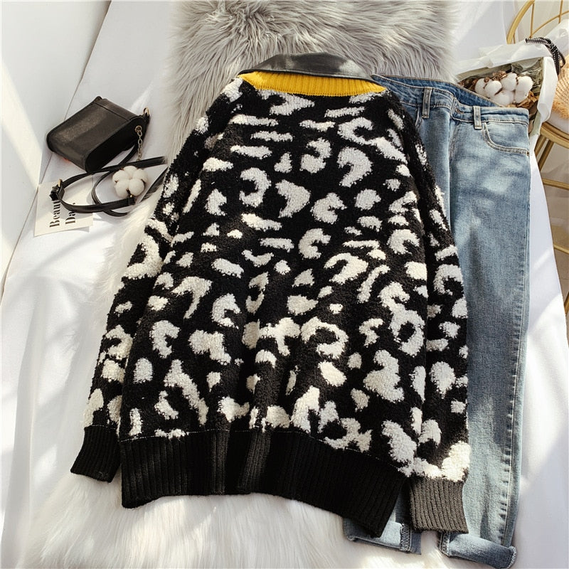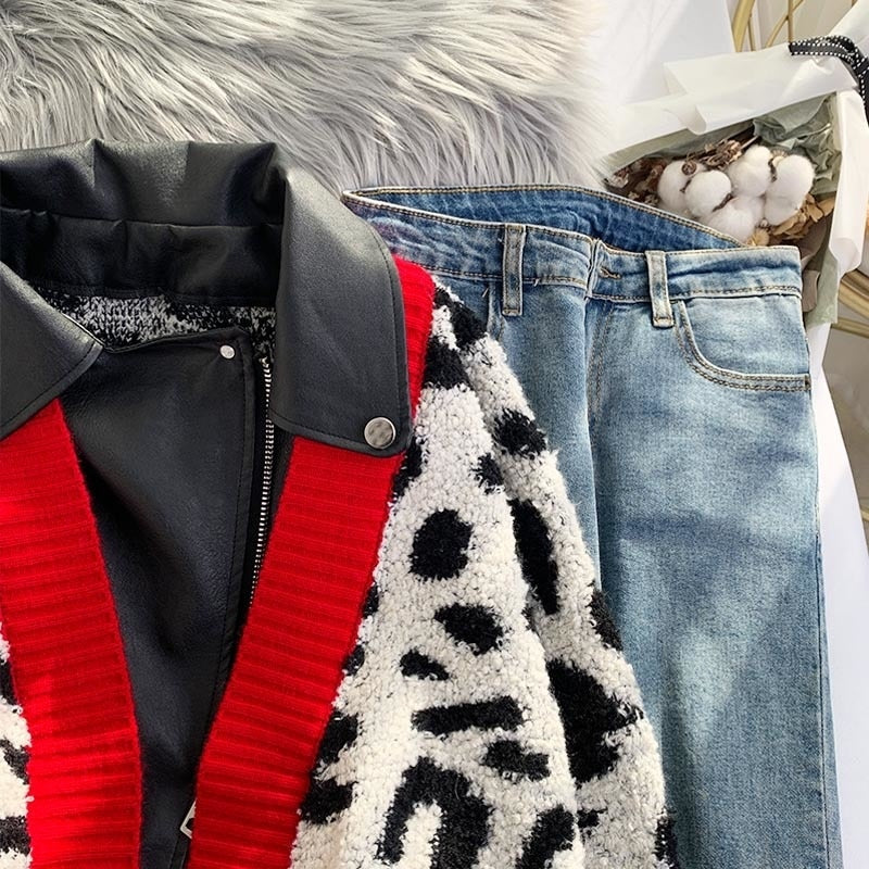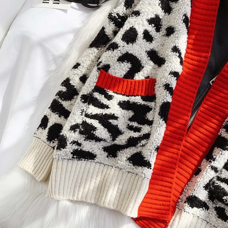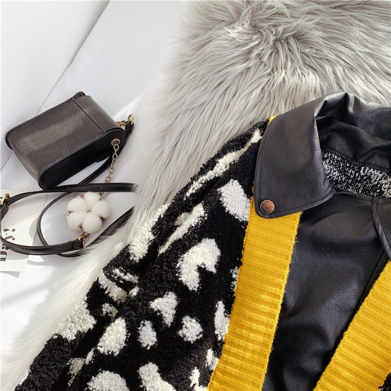 This sweater over leather patchwork style jacket gives a unique look. Featuring a zipper closure, the beautiful geometric pattern is also the perfect way to add some style to your outfit.