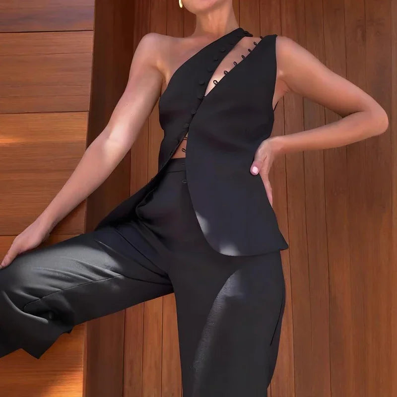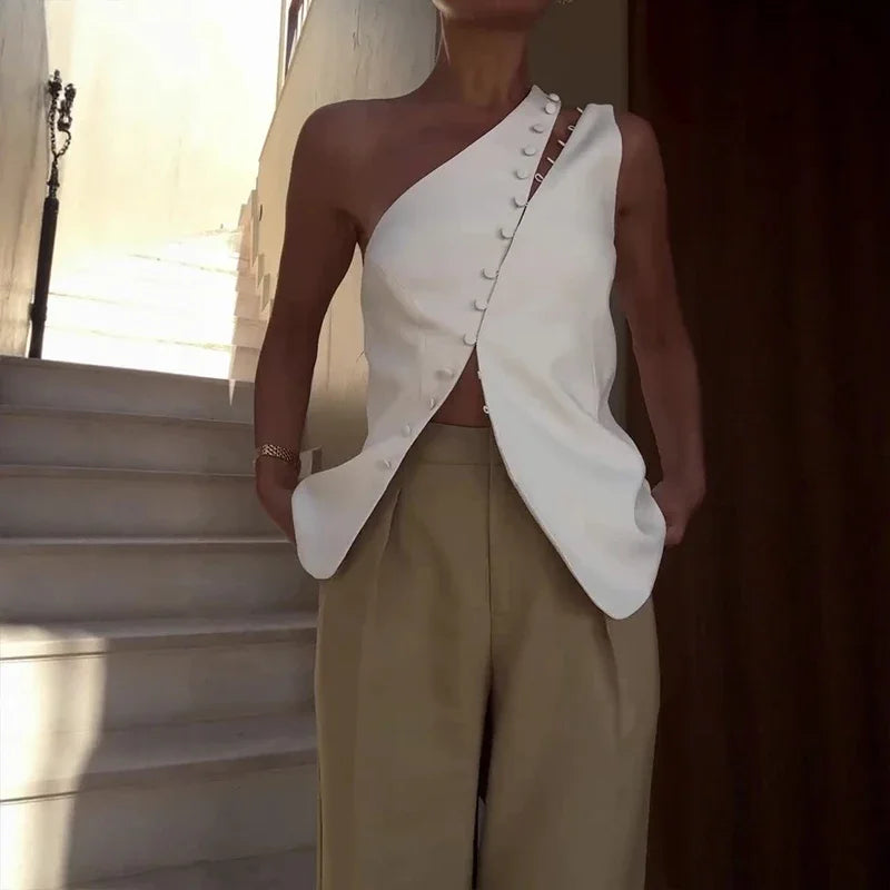 Elevate your wardrobe with this striking one-shoulder top featuring a modern curved button design. The asymmetrical neckline creates an effortlessly chic silhouette, perfect for both casual outings and evening occasions. Crafted for comfort and style, this versatile piece pairs beautifully with jeans, skirts, or tailored trousers. A contemporary essential that brings sophistication to any look.